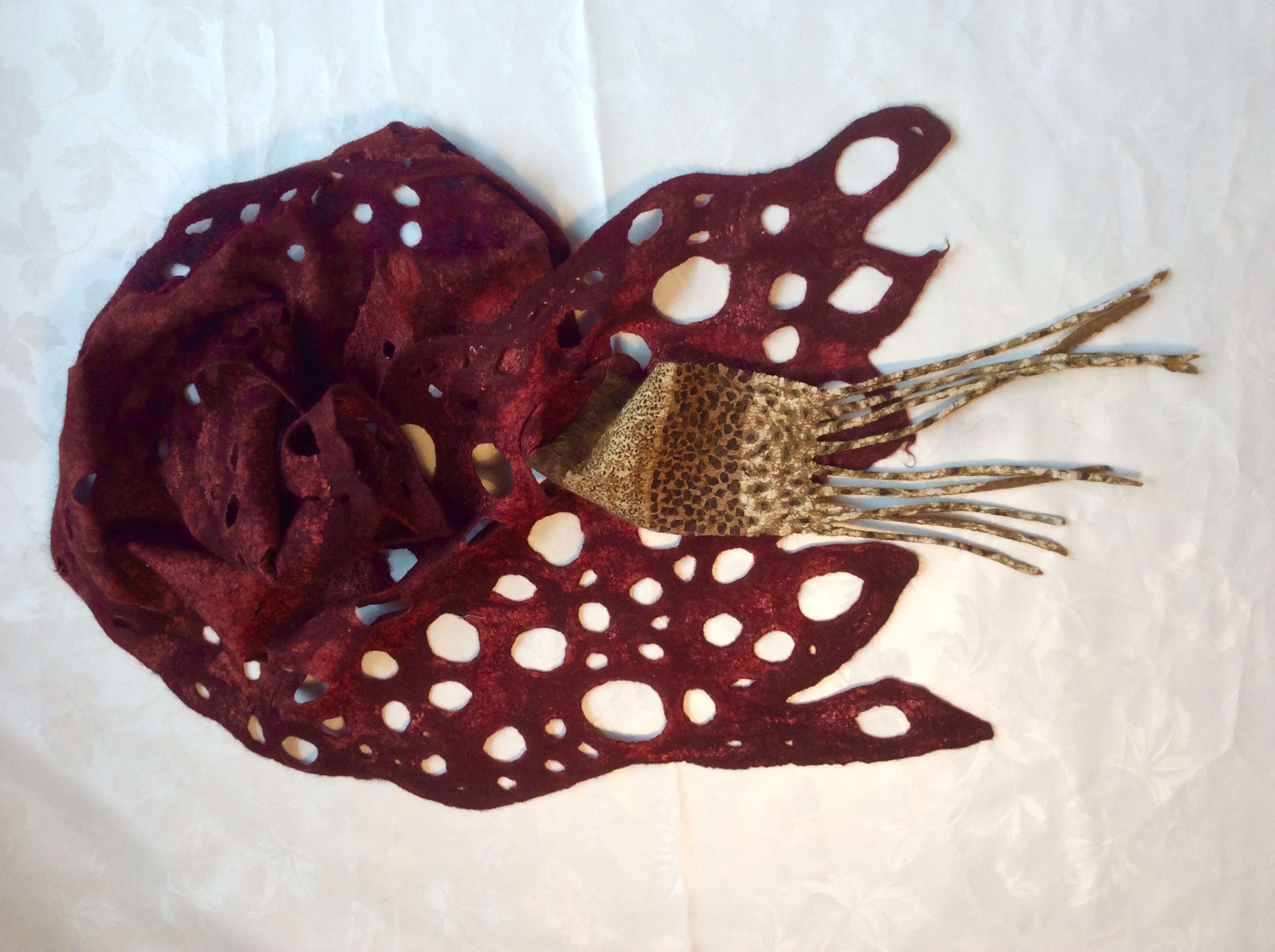 Неликвида валянного у меня немного, но натыкаясь переодически на них, становится безумно обидно за шерсть, потраченное время и силы. Просто порезать на фигурки тоже жаль. Был у меня такой древний палантин, из первых работ. При глажке по мокрому подпалился , пятна желтые появились. Подваляла, покрасила, разрезала часть на клинышки, остальное дырочками под шарфик. Доваляла клинышек, козырек, вставку в шарфик. Сшила. Ну вот. Теперь можно носить. Слава шерсти! Фотки загрузились не в той последовательности, но надеюсь, все понятно.