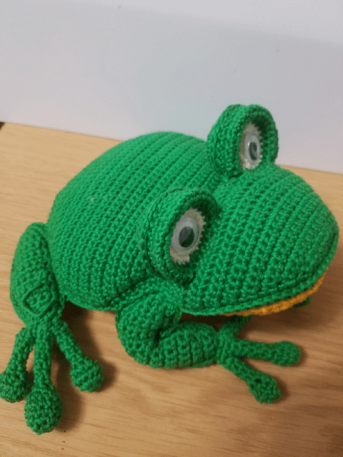 Продолжается моя амигурумная эпопея. После удачно связанной черепахи, муж попросил связать ему лягушку. Сам выбирал в интернете. Ниточки оказались несколько толстоваты, поэтому и лягушка вышла солидных размеров. Почти 20 см. В длину и такая же в ширину. От стрелы с короной муж отказался, зато выпросил связать пенек, т.к.в машине под задним стеклом, с снаружи , лягушка плохо видна. Вот такая лягушечка получилась.