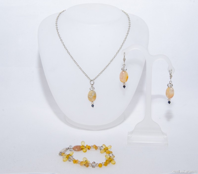 Он совместим абсолютно со всеми минералами. В данном примере: шарики гематита с покрытием эффекта "бензиновой капли" и гранёные бусины ювелирного стекла.