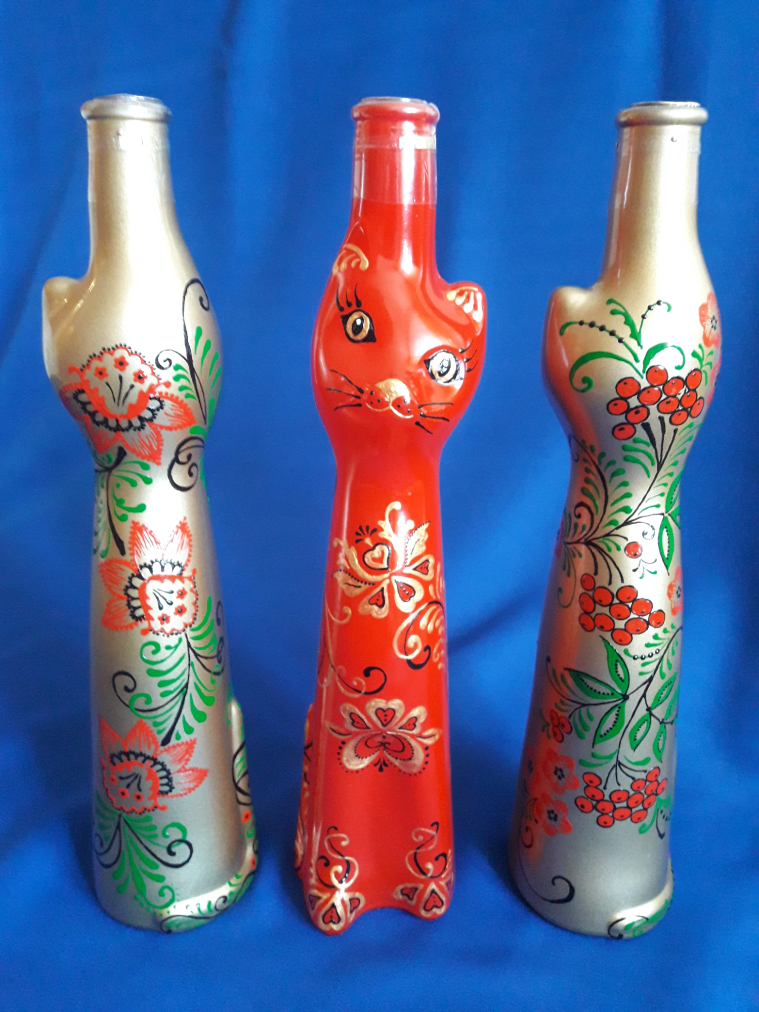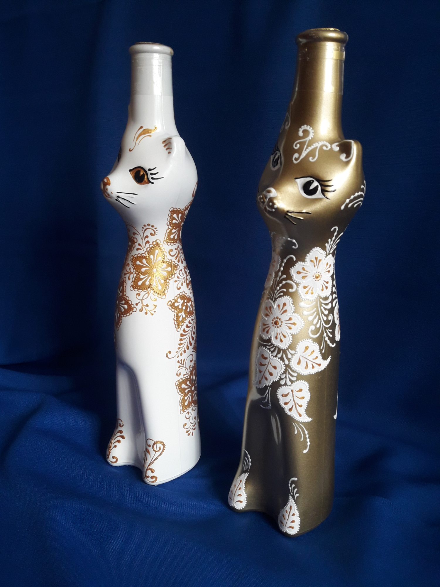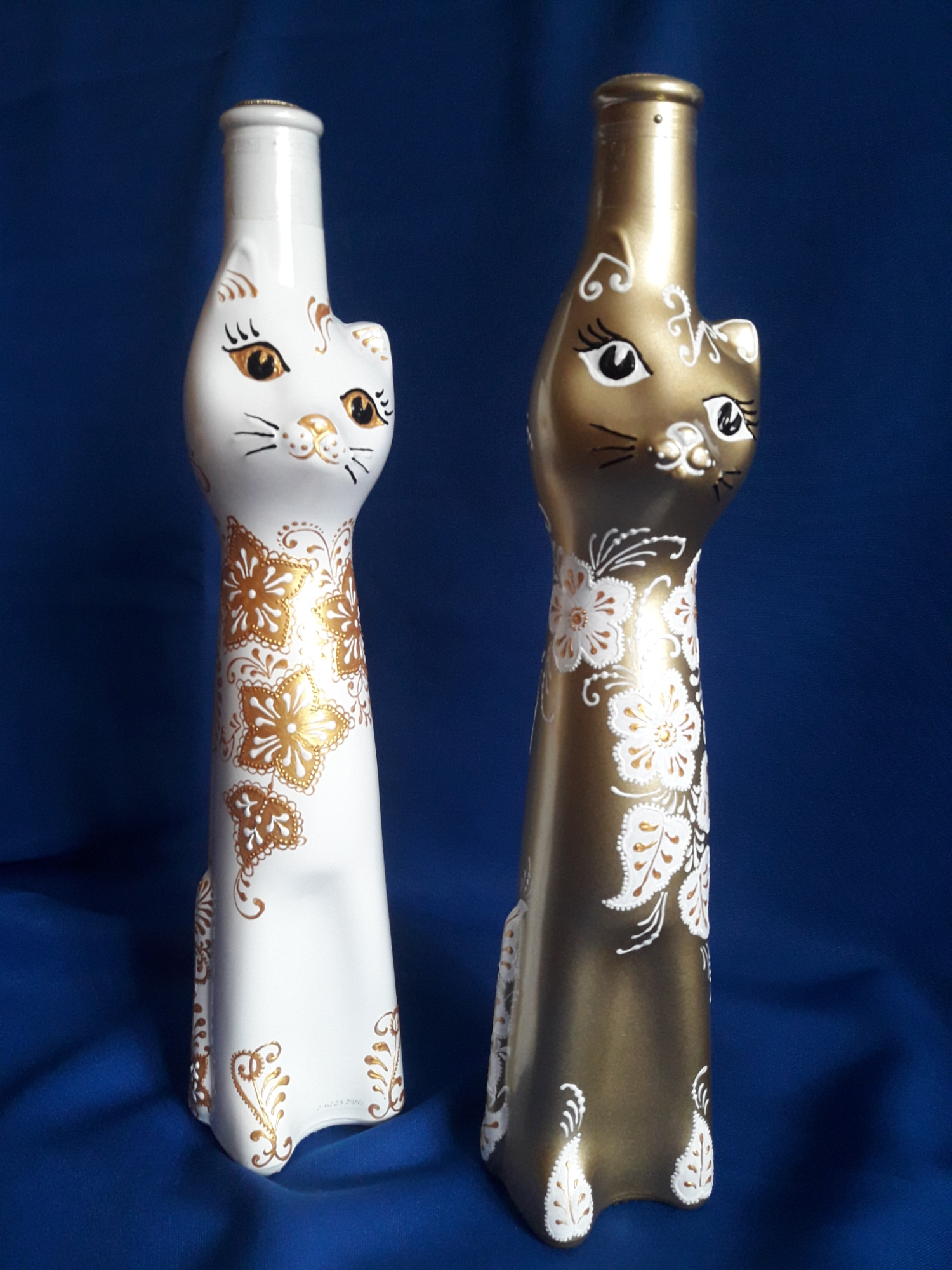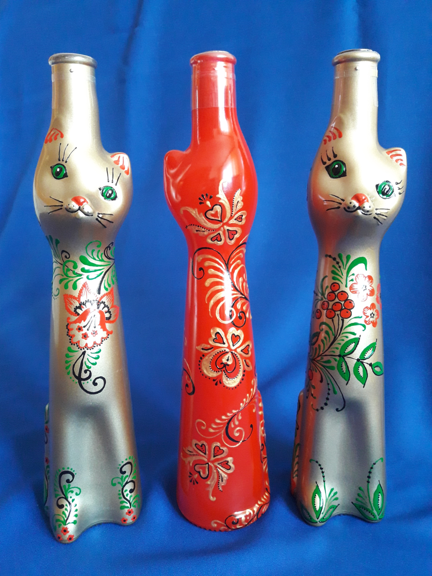 Спасибо, Елена! У нас они в специализированных алкогольных магазинах продаются, правда, сейчас только золотые и белые. А раньше были и из синего стекла, и крашеные голубые, красные, сиреневые.Мои первые расписанные кошки как раз и были синие.