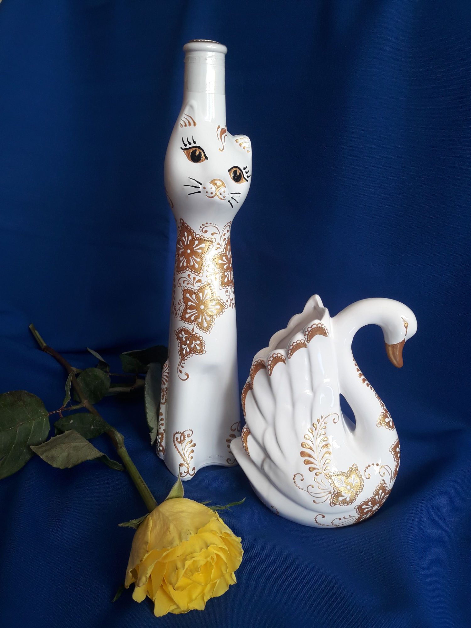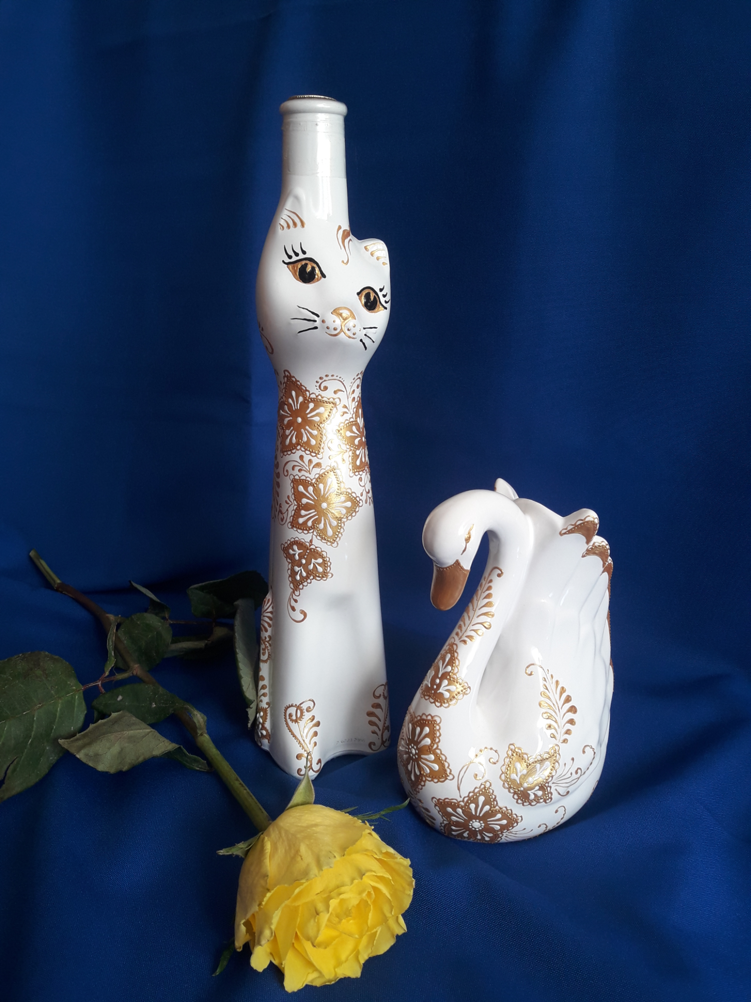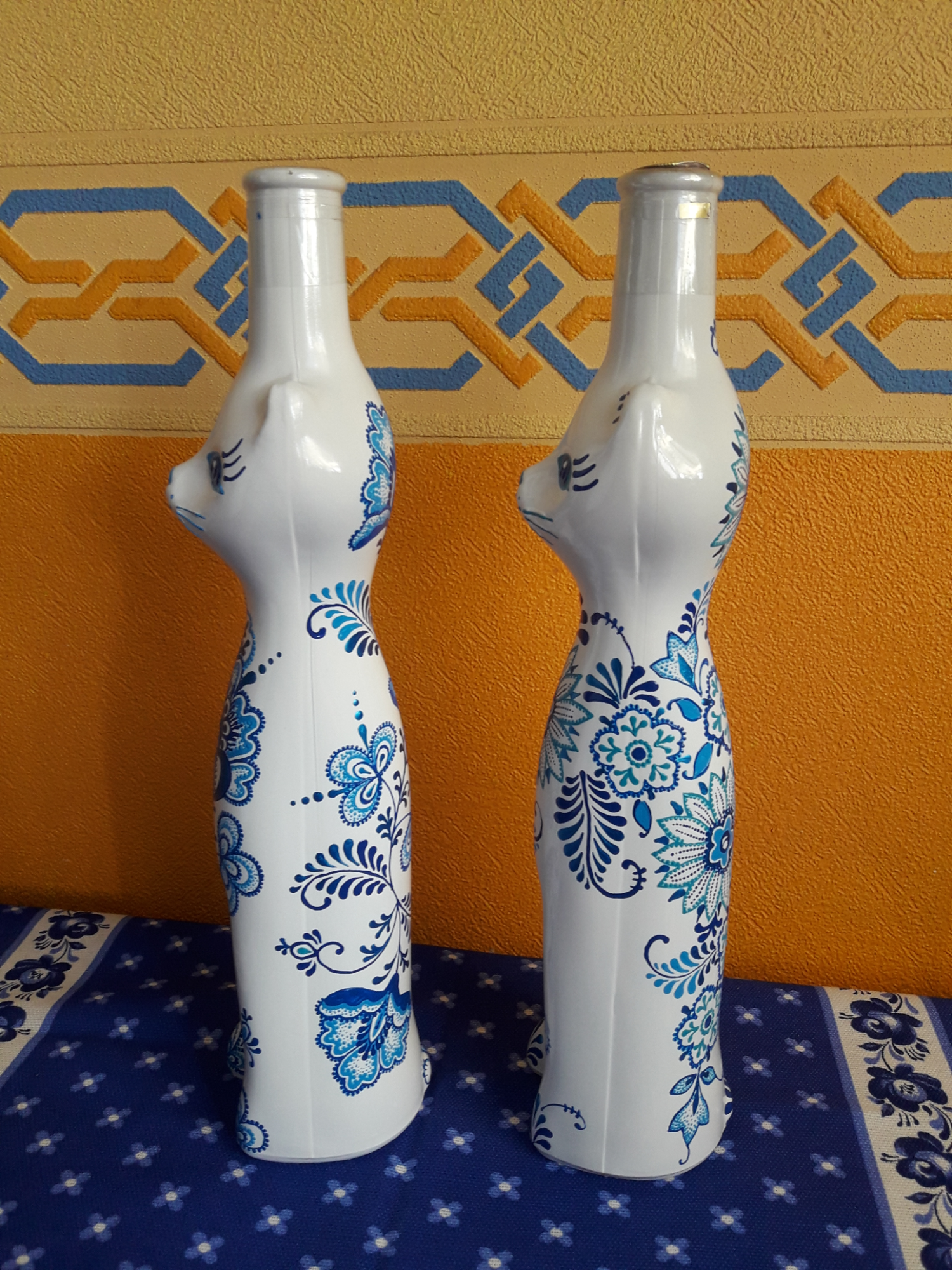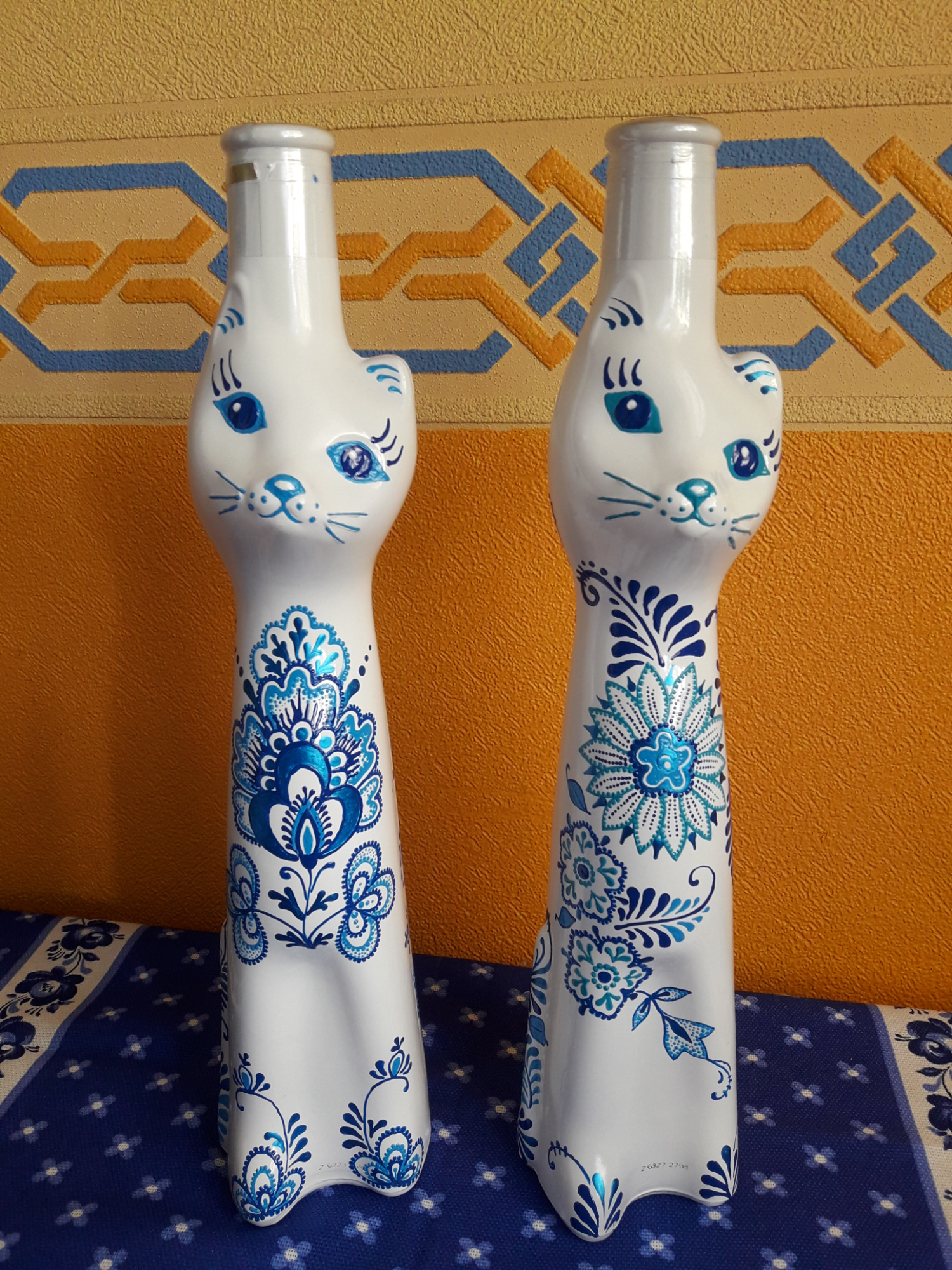 Спасибо, Елена! У нас они в специализированных алкогольных магазинах продаются, правда, сейчас только золотые и белые. А раньше были и из синего стекла, и крашеные голубые, красные, сиреневые.Мои первые расписанные кошки как раз и были синие.