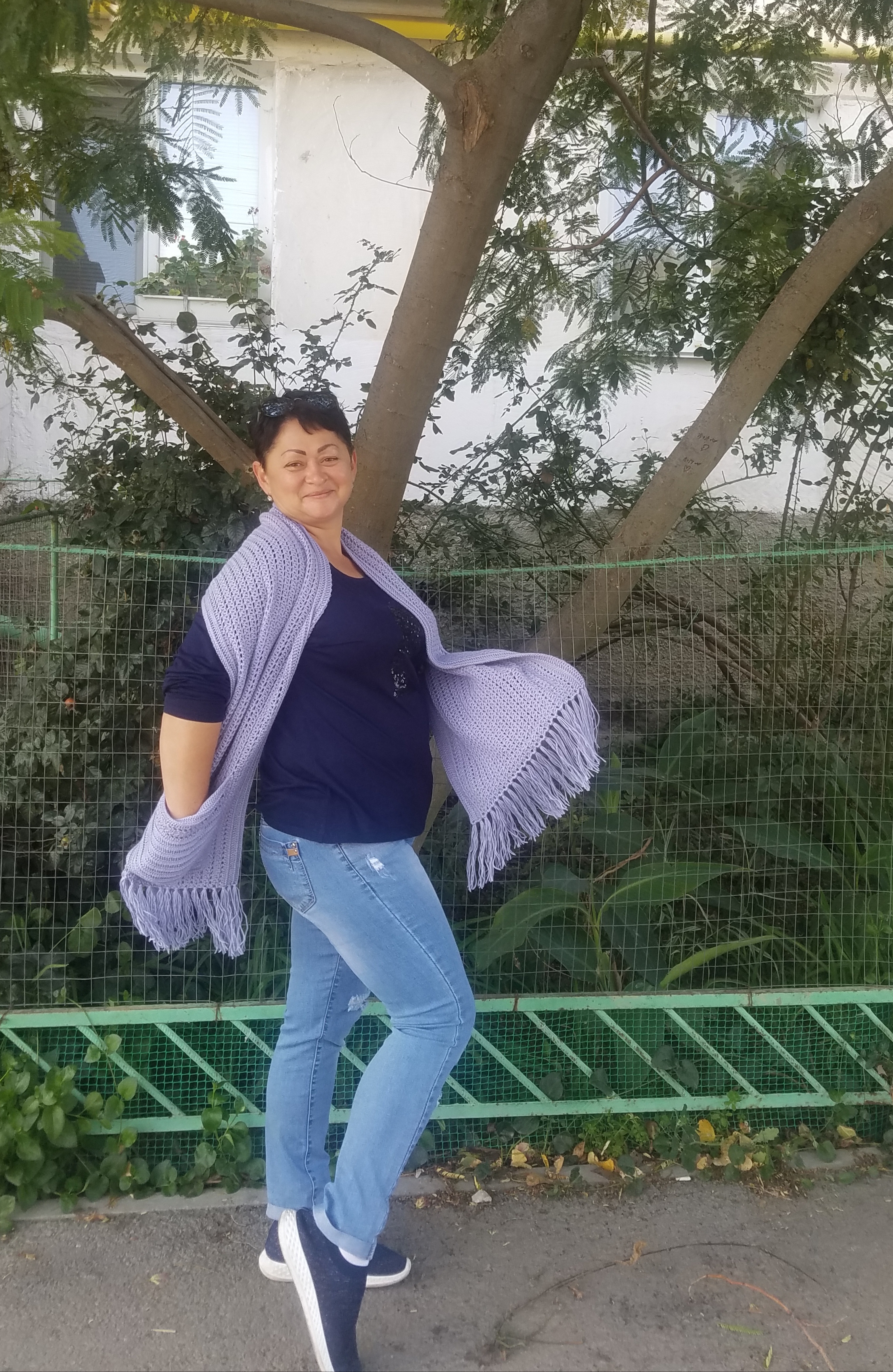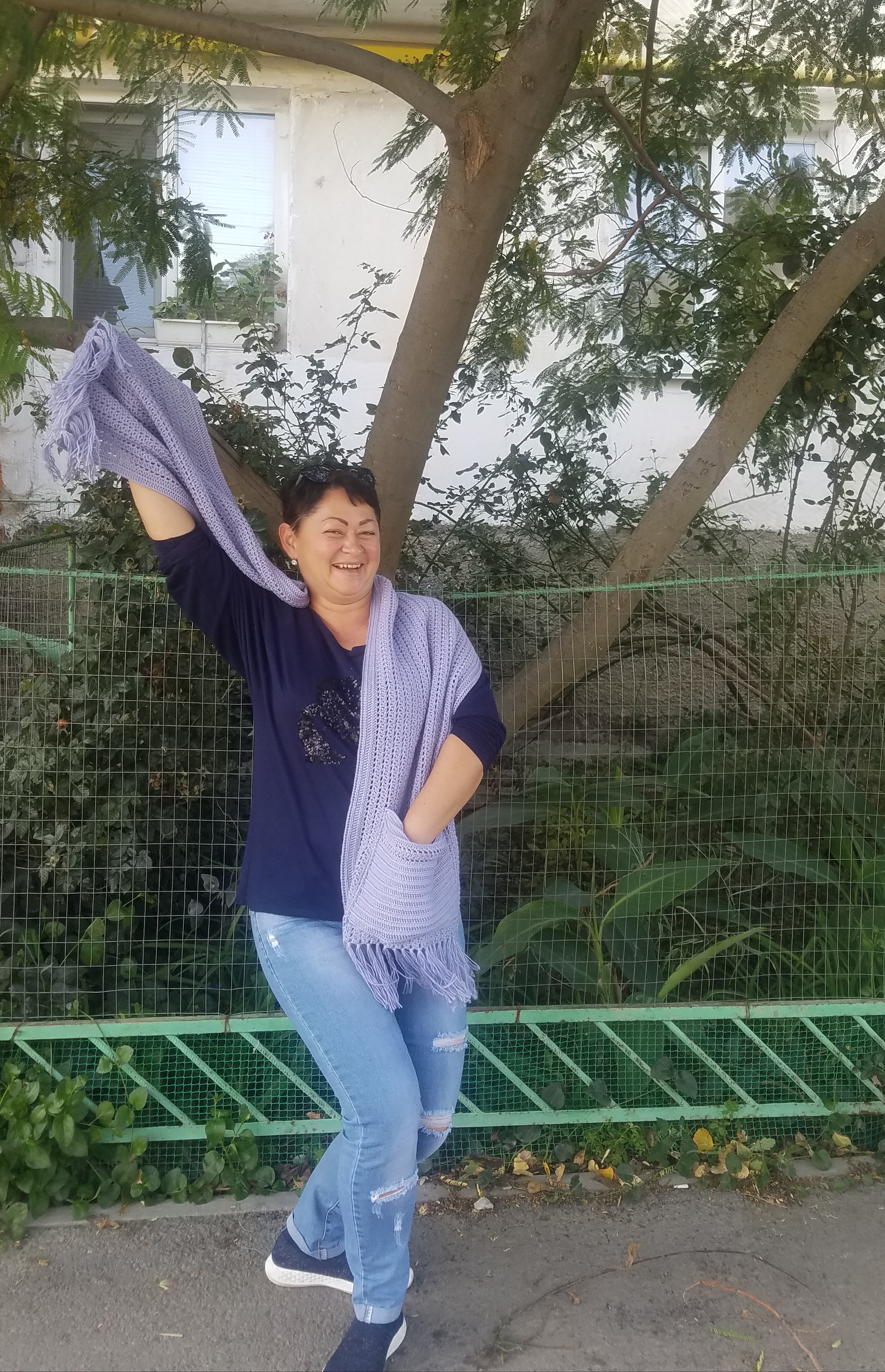 Заказала мне знакомая палантин с карманами непременно лилового цвета .
