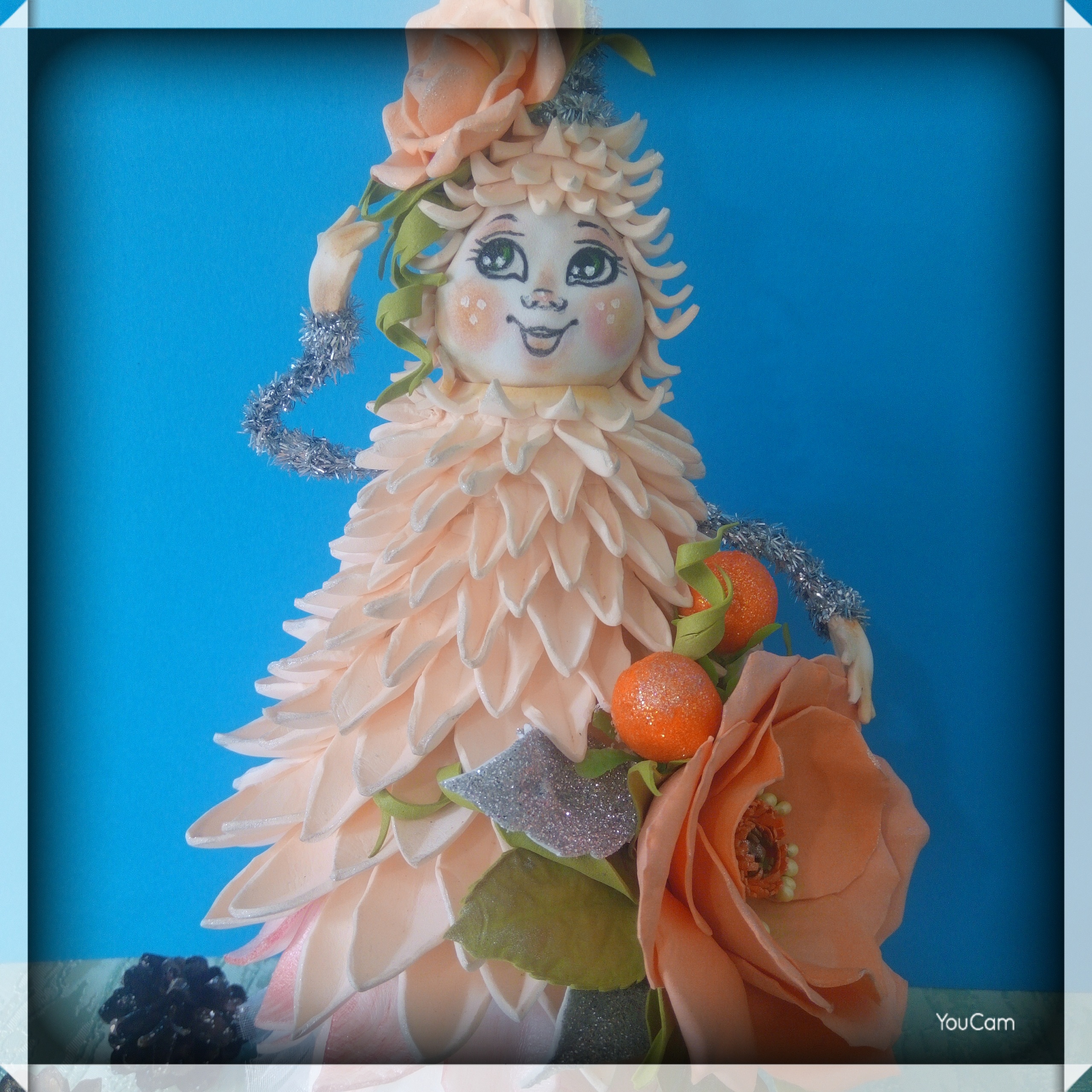 И всё это "богатство" соединилось в эдакую кокетку в абрикосовых тонах.Видимо,это разновидность ёлочек-топотушек ,коими я никогда не увлекалась.Высота её 24 см. до верхней ягодки.Форму верхушечки можно немного менять.