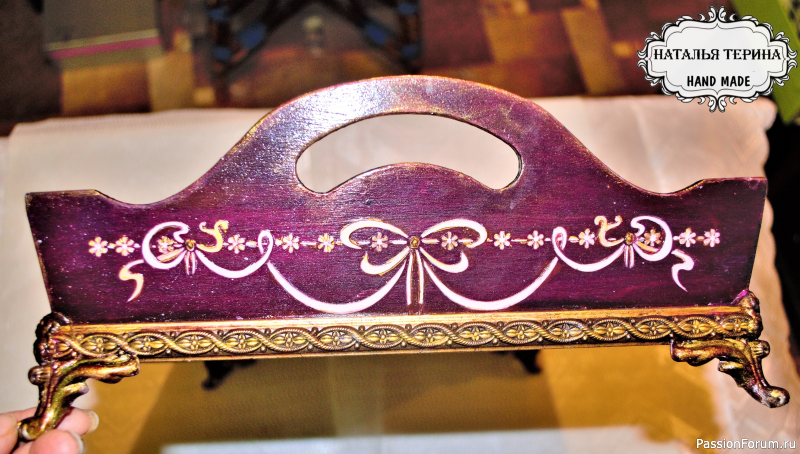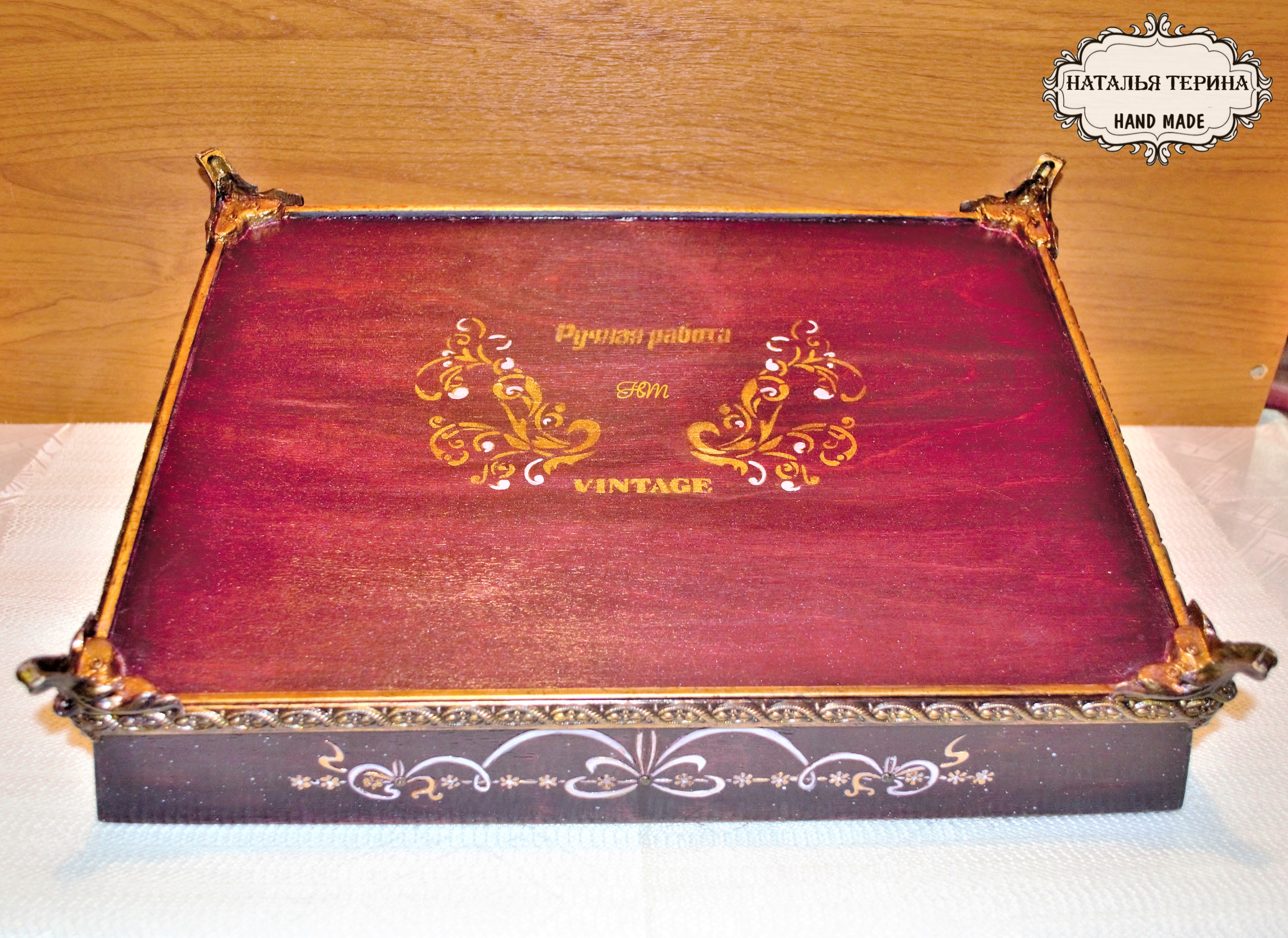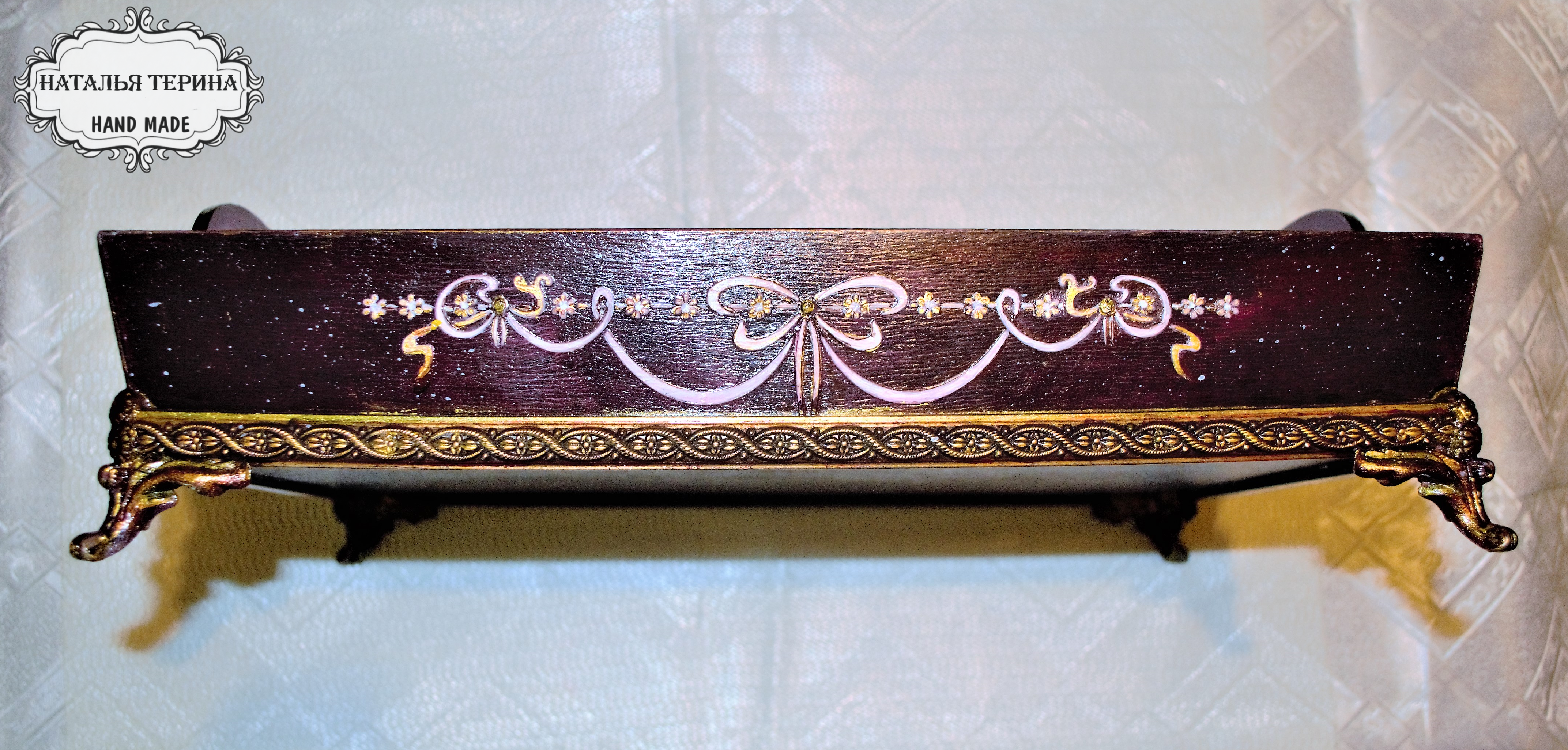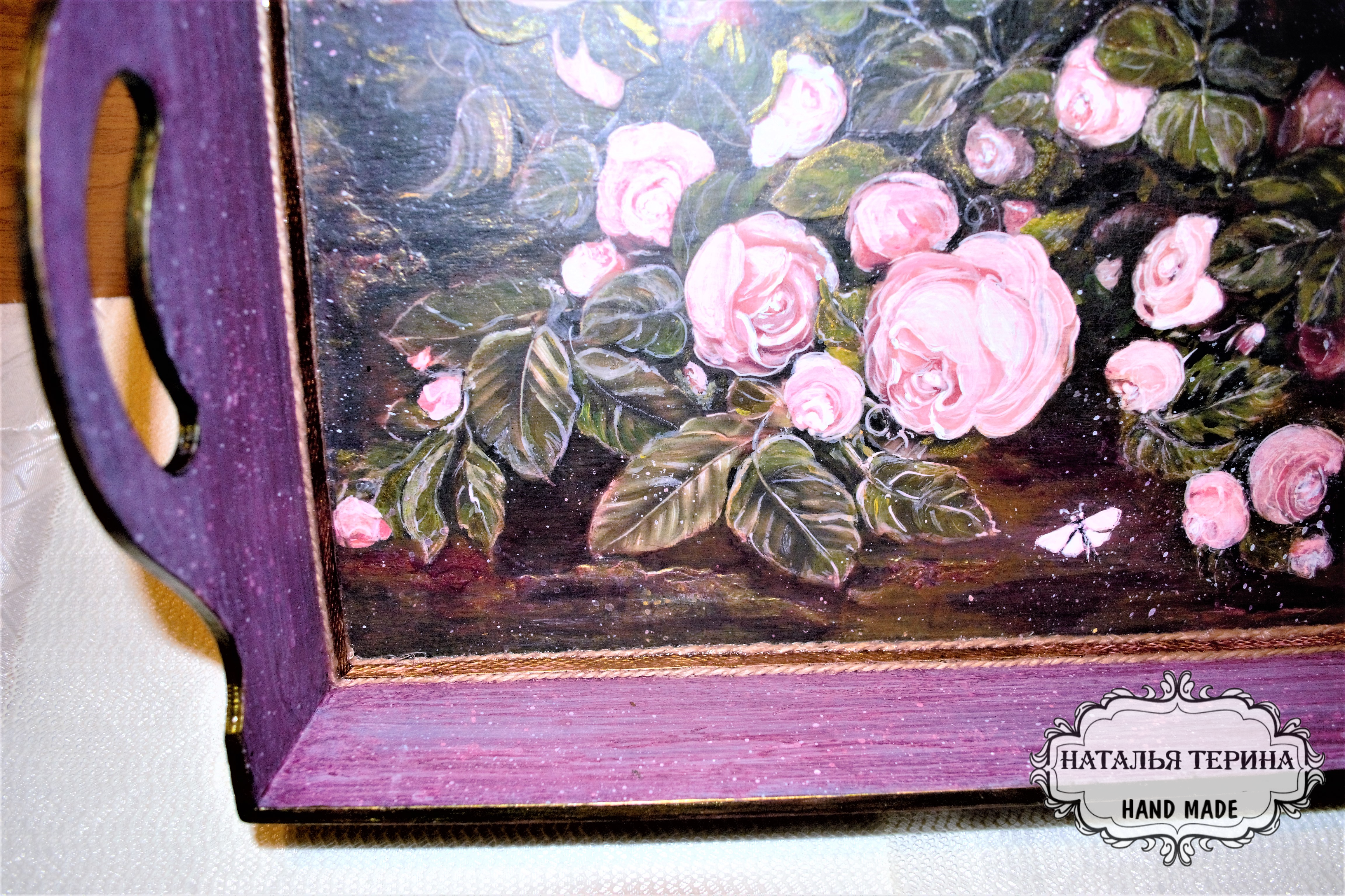 Немного о подносе: Поднос прямоугольной формы, стоит на изящных ножках. У подноса есть ручки - выемки, которыми очень удобно пользоваться. По бортам сделан орнамент и украшен фурнитурой. В центре подноса выполнена картина "Розы" с добавлением старины, потертостей, капель краски. Каждый цветок, лепесток, бабочки прорисованы акриловыми красками, некоторые элементы выделены 3D гелем. Сам поднос выкрашен морилкой, цвет "Слива".