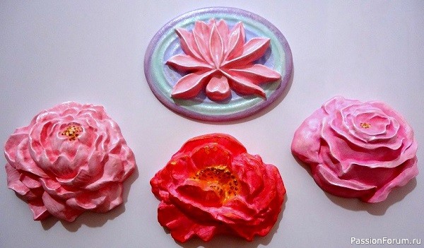 Идея сделать магнитики пришла спонтанно. Были у меня очень красивые формочки, которые я использовала для аромакамней. А почему бы не применить их и на холодильник. Использовала я формочки и для мыла, только заполняла их совсем немного, чтобы были менее высокие. И вот, что получилось. Раскрашивала фигурки акриловыми красками. Приклеила на них неодимовые магнитики в виде маленькой плоской таблеточки.