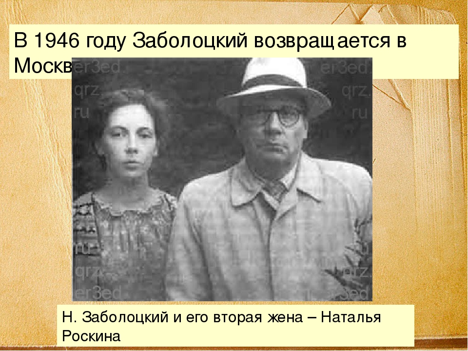 Но несмотря на такие жизненные подходы, брак Николая Алексеевича сложился удачно и был весьма прочным. Он женился на однокурснице – стройной, темноглазой, немногословной, которая стала прекрасной женой, матерью и хозяйкой. От обэриутов Заболоцкий постепенно ушёл, его эксперименты со словом и образом существенно расширились, а к середине 1930-х он стал известным поэтом. Но донос на поэта, случившийся в 1938 году, разделил его жизнь и творчество на две части. Известно, что Заболоцкого на следствии истязали, но он так ничего и не подписал. Может быть, поэтому ему дали минимальные пять лет. Многие писатели были перемолоты ГУЛАГом — Бабель, Хармс, Мандельштам. Заболоцкий выжил — как считают биографы, благодаря семье и супруге, которая была его ангелом-хранителем. Его сослали в Караганду и жена с детьми последовала за ним. Освободился поэт только в 1946 благодаря хлопотам известных коллег, в частности, Фадеева. После освобождения Заболоцкому разрешили поселиться в семьей в Москве. Его восстановили в Союзе писателей, а писатель Ильенков предоставил ему свою дачу в Переделкино. Он много работал над переводами. Постепенно всё наладилось: публикации, известность, достаток, квартира в Москве и орден Трудового красного знамени. Но в 1956 году случилось то, чего Заболоцкий никак не ожидал – он него ушла жена. 48-летняя Екатерина Васильевна, жившая многие годы ради мужа, не видевшая от него ни заботы, ни ласки, ушла к писателю и известному сердцееду Василию Гроссману. «Если бы она проглотила автобус, — пишет сын Корнея Чуковского Николай, — Заболоцкий удивился бы меньше!». На смену удивлению пришёл ужас. Заболоцкий был беспомощен, сокрушён и жалок. Его горе привело его к Наталье Роскиной – 28-летней одинокой и умной женщине. В растерянности от произошедшего он просто позвонил некой даме, которая любила его стихи. Это всё, что он о ней знал. Он позволил той, что знала все его стили с юных лет, они встретились и стали любовниками. В этом треугольнике счастливых не было. И сам Заболоцкий, и его супруга, и Наталья Роскина мучились по-своему. Но именно личная трагедия поэта и подвигла его к созданию цикла лирических стихов «Последняя любовь», ставшего одним из самых талантливых и щемящих в отечественной поэзии. Но среди всех стихов, вошедших в сборник, особняком стоит «Признание» — подлинный шедевр, целая буря чувств и эмоций. В этом стихотворении две женщины поэта слились в один образ. Екатерина Васильевна вернулась к мужу в 1958-м. Этим годом датируется еще одно знаменитое стихотворение Н. Заболоцкого «Не позволяй душе лениться». Его писал уже смертельно больной человек. Через 1,5 месяца после возвращения жены Николай Заболотский скончался от второго инфаркта.