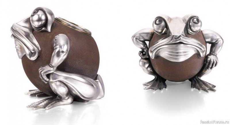 И еще две необычных зажигалки в продолжение огнеопасной темы. Очаровательный слон-зажигалка демонстрирует способность Фаберже превращать функциональный предмет в скульптурное произведения искусства. Контейнеры и настольные зажигалки, реалистично смоделированные в виде причудливых животных, или, как в начале этой публикации, забавно обобщенные и похожие на нэцкэ, первоначально выполнялись блестящим мастером Юлиусом Раппопортом, а позже изготавливались Первой Серебряной артелью по оригинальным разработкам фирмы Фаберже. Знакомые домашние и экзотические животные стали заселять кабинеты и гостиные модной клиентуры фирмы. Реалистично смоделированные и тщательно продуманные, эти новинки имели большой успех у публики.