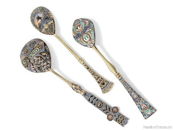 Три ложки из позолоченного серебра, украшенные перегородчатой и живописной эмалью (длина 15,8 см), Фаберже, мастер Федор Рюкерт.