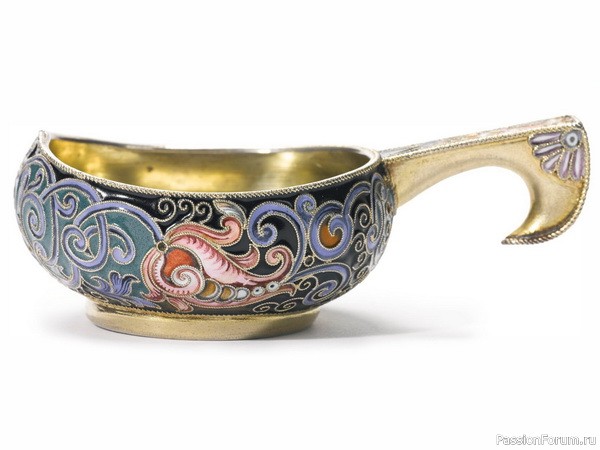 Ковш из позолоченного серебра, украшенный перегородчатой эмалью (длина 14 см), мастер Федор Рюкерт.