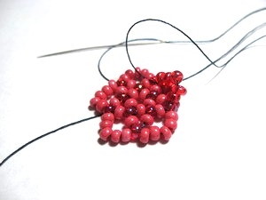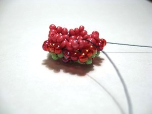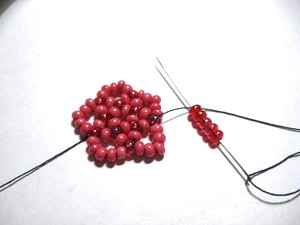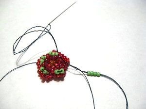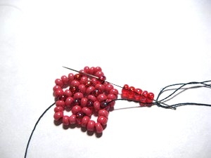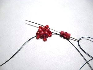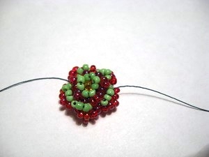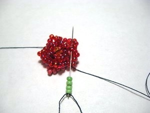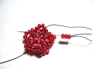 Для этого мы будем использовать те же красные бусины основы, к которым уже подплетали лепестки.