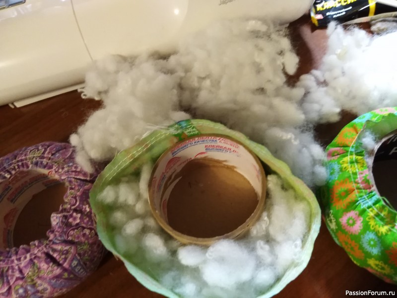 5. В расстояние между бобиной и тканью набиваю наполнитель. Затягиваю сверху нитки, делая равномерную сборку.