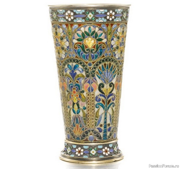 Серебряный позолоченный стакан, украшенный витражной эмалью plique-à-jour, Овчинников, Москва, 1908-1917 гг.