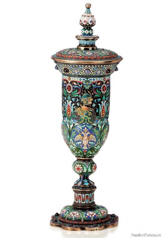 Серебряный позолоченный кубок с крышкой, украшенный перегородчатой эмалью и драгоценными камнями, с изображением двуглавого орла и Святого Георгия-Победоносца. Овчинников, Москва, 1899-1908 гг.