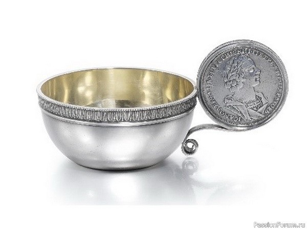Серебряная чарка, ручка украшена серебряным рублем Петра Великого 1725 года, Овчинников, Санкт-Петербург, 1908 г.
