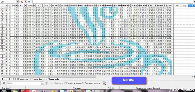 Судя по сетке рисунка высота 13 квадратов по 10 клеток, в ширину 9 квадратов по 10 клеток. Каждая клеточка — клетка в сетке филейки. Я уже на каком то форуме писала, что схемы перевожу в Excel и попутно разбираю ряды вязания. Потом только начинаю вязать, удобно тем, что не надо считать клетки пустые и заполненные. Это образец одного фрагмента, для вязания готовила. Цифры на синем фоне это сколько клеток заполненных, остальное свободная клеточка. Можно сделать схему и распечатать. У меня один рисунок который вязала при таком количестве клеток, получился размер 49*70 см, без влажной обработки. Если нужна помощь, пишите, отвечу.