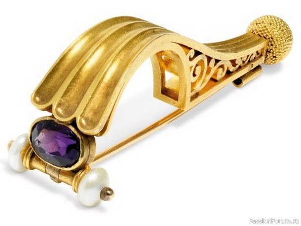 Эта брошь с аметистом и жемчугом является копией броши из скифского клада, которую вы видите на стенде. Мастер Эрик Коллин, Фаберже, Санкт-Петербург.