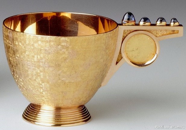 Золотая чарка с фактурной поверхностью, имитирующей ткань. Ручка чашки украшена рублем Екатерины Великой, датированным 1777 годом, и четырьмя сапфирами, высота 5 см, Фаберже, мастер Эрик Коллин,1874 г. Коллекция британских монархов.