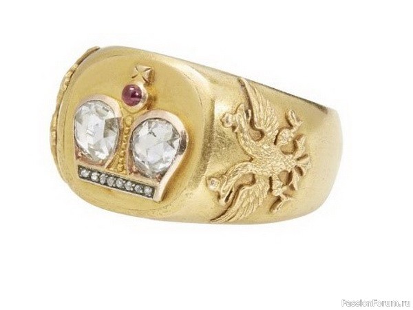 Золотой наградной перстень, украшенный изображением короны с рубином и бриллиантами, Фаберже, мастер Эрик Коллин, до 1899 г. Коллекция британских монархов.