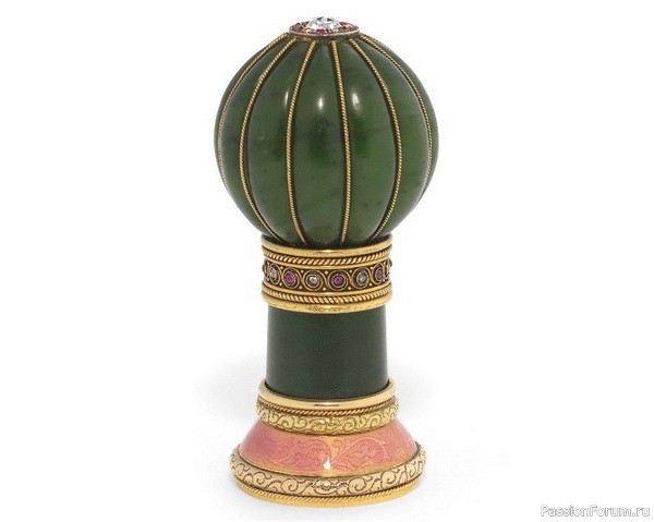 Нефритовая печать в золотой оправе, украшенная гильошированной эмалью, рубинами и бриллиантами, высота 7,6 см, Фаберже, мастер Эрик Коллин, около1890 г.