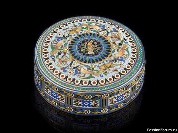 Круглая серебряная позолоченная шкатулка, украшенная перегородчатой эмалью, Овчинников, Москва, 1885 г.