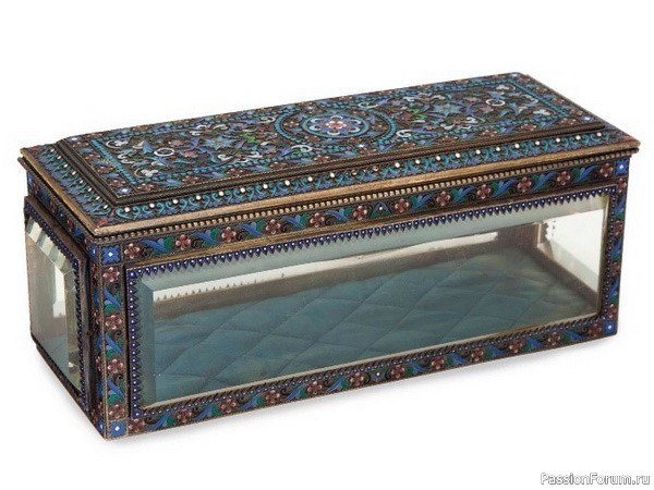 Серебряная позолоченная шкатулка-витрина со стеклянными стенками, украшенная перегородчатой эмалью (длина 24 см), Овчинников, Москва, около1880 г.