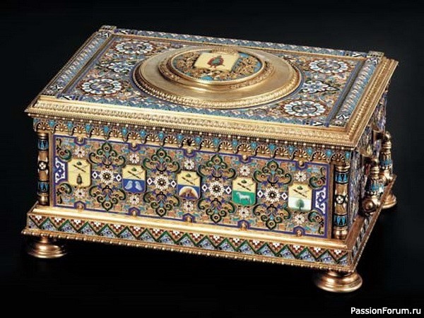 Серебряная позолоченная шкатулка на ножках с гербом Рязани на крышке и двенадцатью гербами рязанских уездов на боковинах (Михайловский, Зарайский, Данковский, Пронский, Спасский, Сапожокский, Скопинский, Егорьевский, Раненбургский, Касимовский, Ряжский и Рязанский). Шкатулка украшена перегородчатой эмалью (длина 32,5 см), Овчинников, Москва, 1893 г.