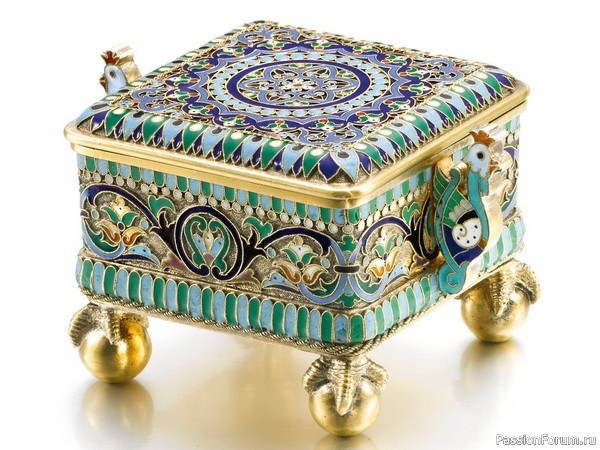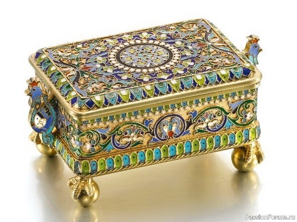 Серебряная позолоченная шкатулка на ножках в виде лап, сжимающих шар, с ручками-петушками, украшенная перегородчатой эмалью (длина 11,5 см), Овчинников, Москва, 1880 г.