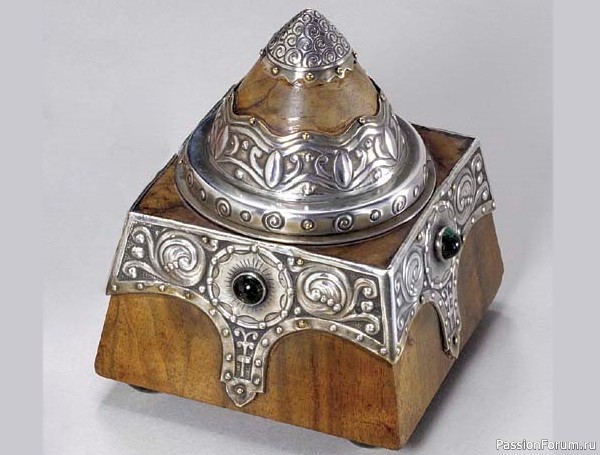 Деревянная шкатулка в серебряной оправе в панславянском стиле, украшенная полудрагоценными камнями (высота 14 см), Овчинников, Москва, 1908-1917 гг.