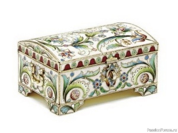 Серебряная позолоченная шкатулка-сундучок с растительным узором, украшенная перегородчатой эмалью (длина 10,7 см), Овчинников, Москва, 1880 г.