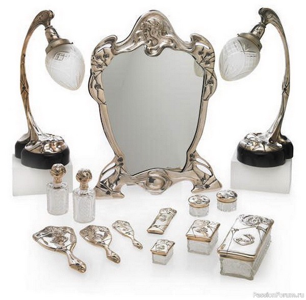 серебряный будуарный набор напомнил детство, у нас была настольная лампа с таким плафоном, плафон отчётливо врезался в память, а вот металлическую стойку не запомнила.
