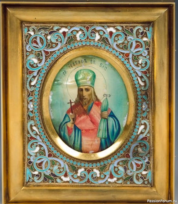 Святой Иосиф - миниатюрная икона, написанная на перламутре, в серебряном позолоченном окладе, украшенном перегородчатой эмалью, 12,5 см, «Ф.А. Лорие», Москва, до 1899 г.