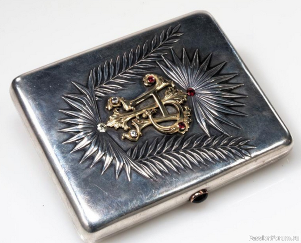 Серебряный портсигар с чеканными пальметтами и накладной позолоченной монограммой, украшенный драгоценными камнями, «Ф.А. Лорие», Москва,1899-1908 гг.