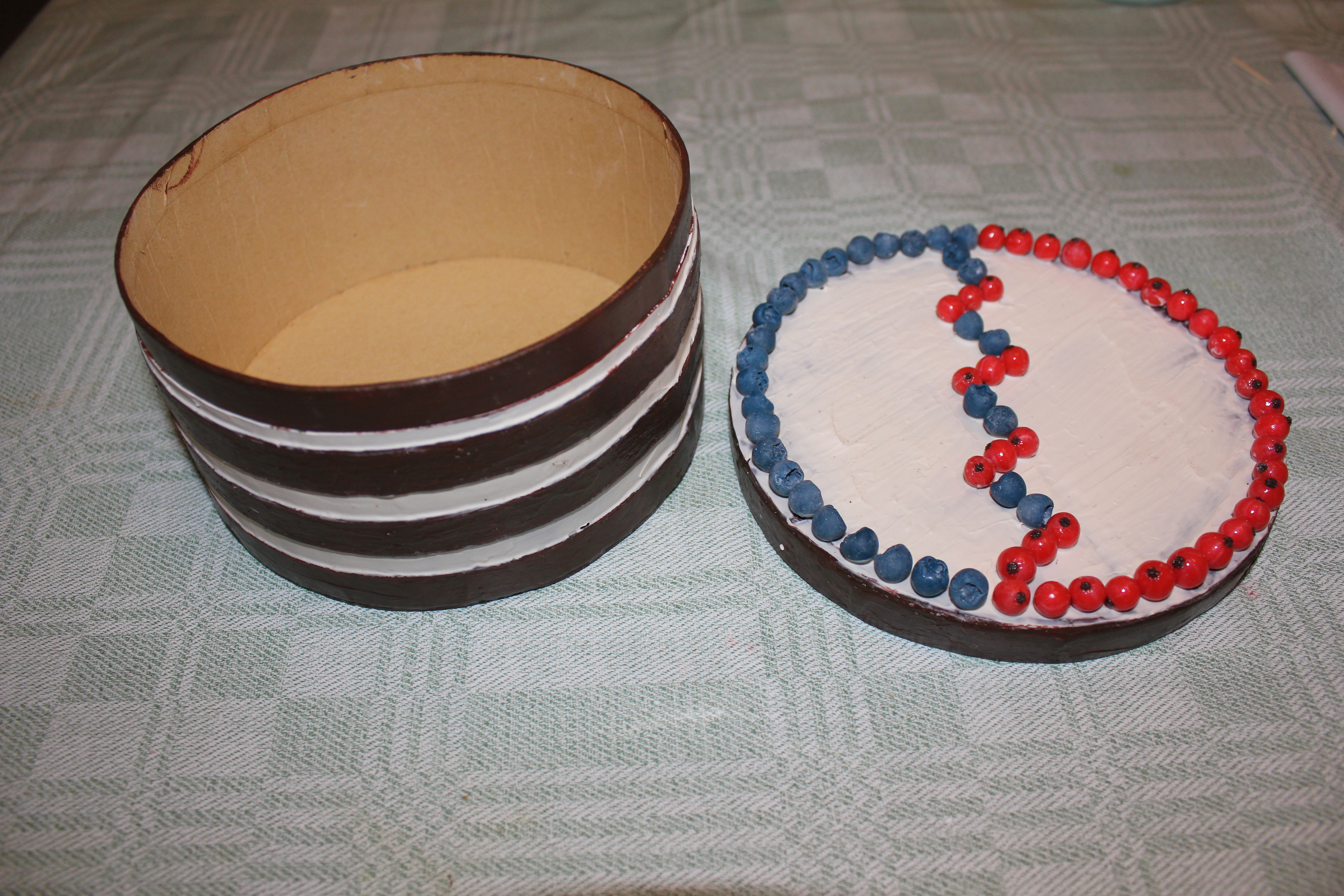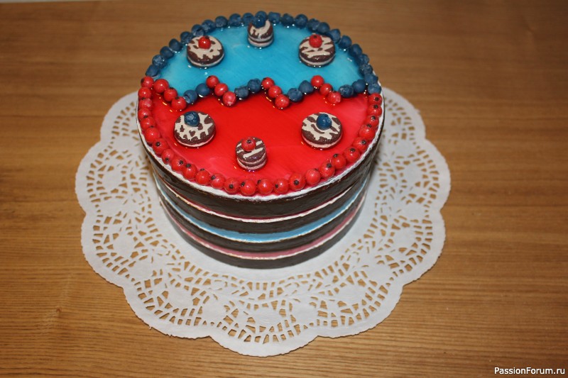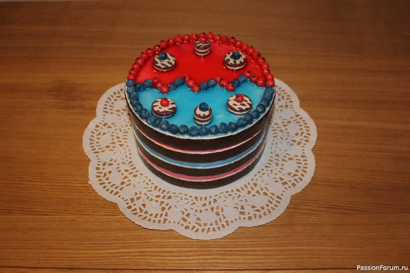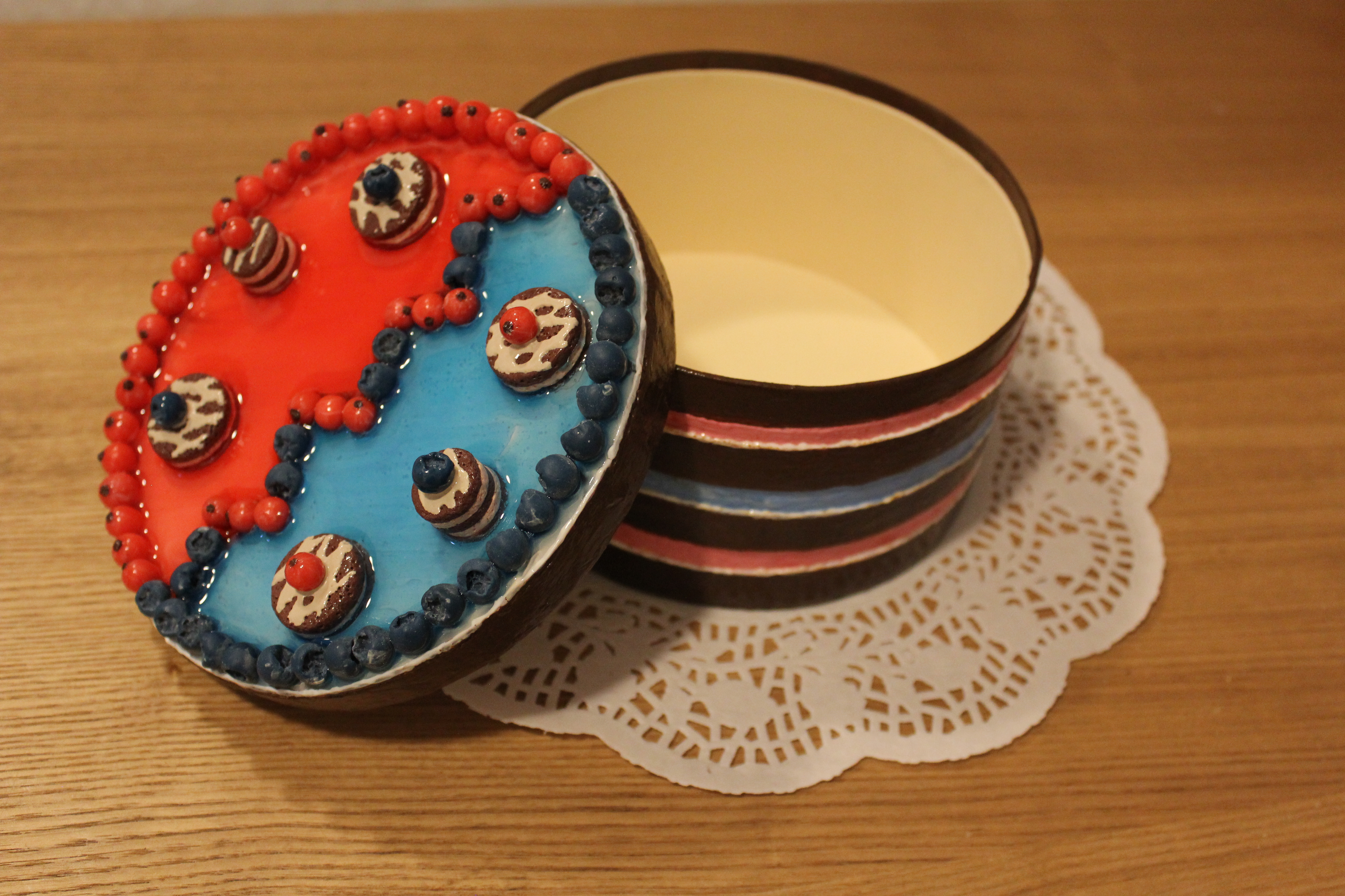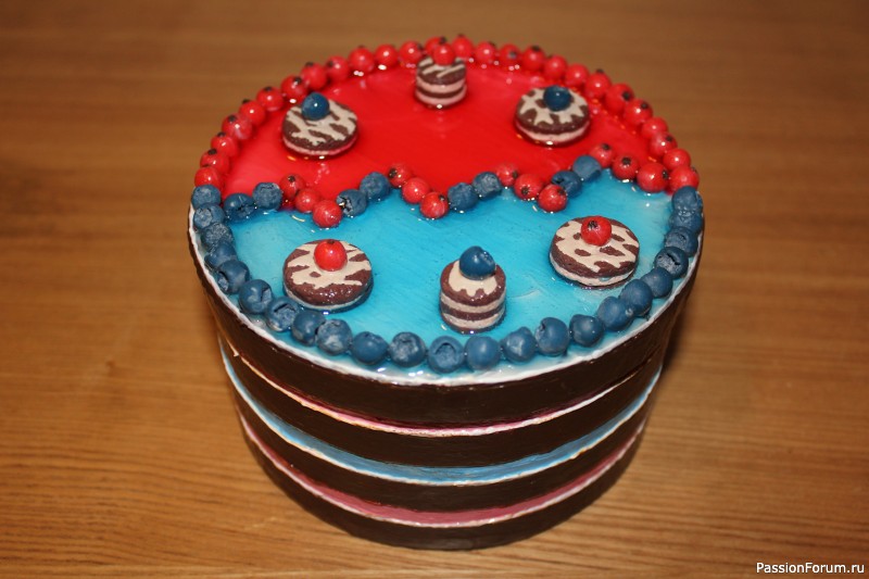 Я на три недели выпала из жизни, а теперь вернулась и вижу столько всего интересного. Твой тортик очень заманчивый. Не забывай предупреждать гостей, что он не настоящий. Я тоже как то делала шкатулочку-пироженное в таком стиле. Это здорово смотрится. Но скажи, зачем ты покрасила верх? Красные ягодки немного теряются, а синий как то не совсем съедобный. Не лучше было «крем» оставить светлого, более плотного, оттенка?