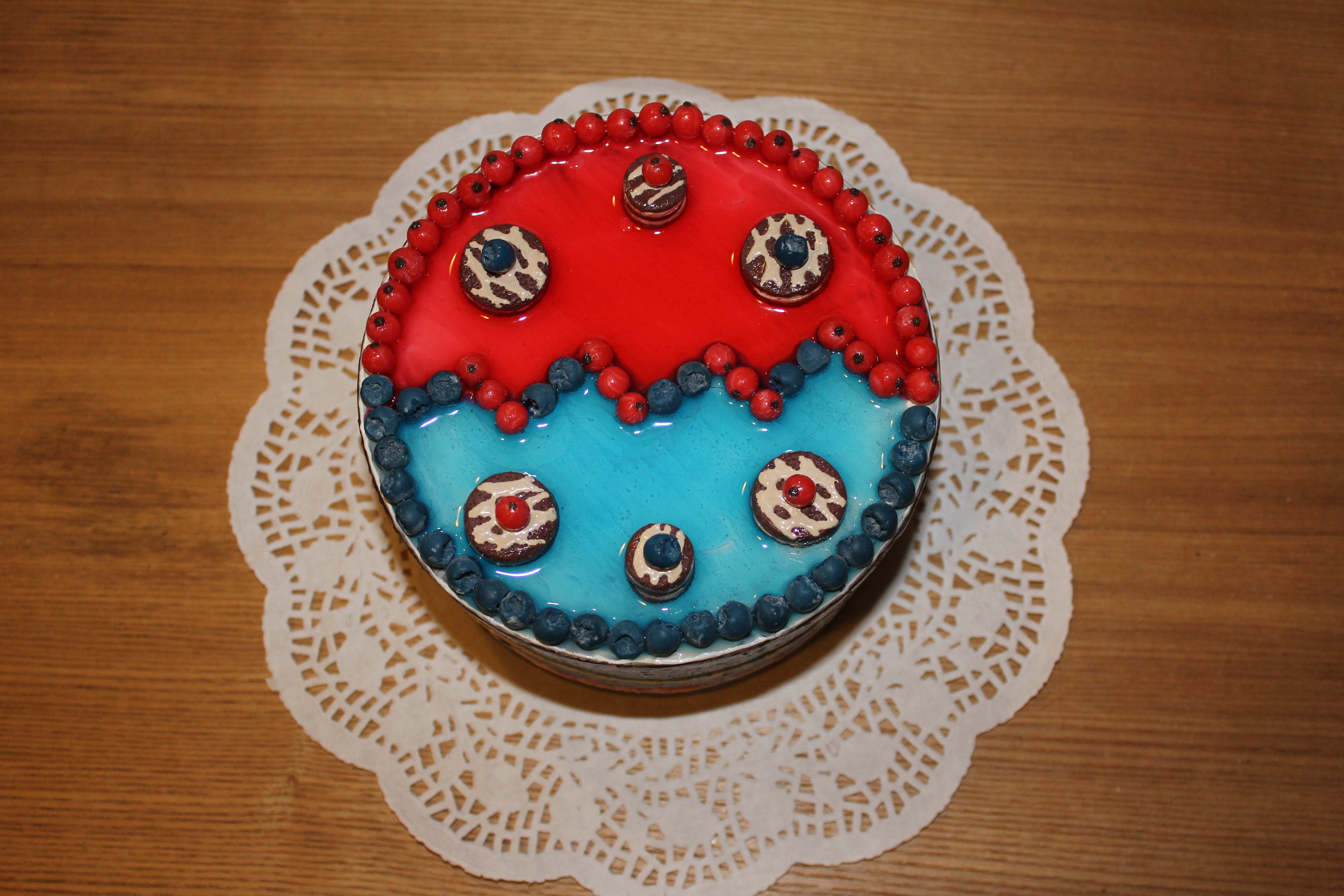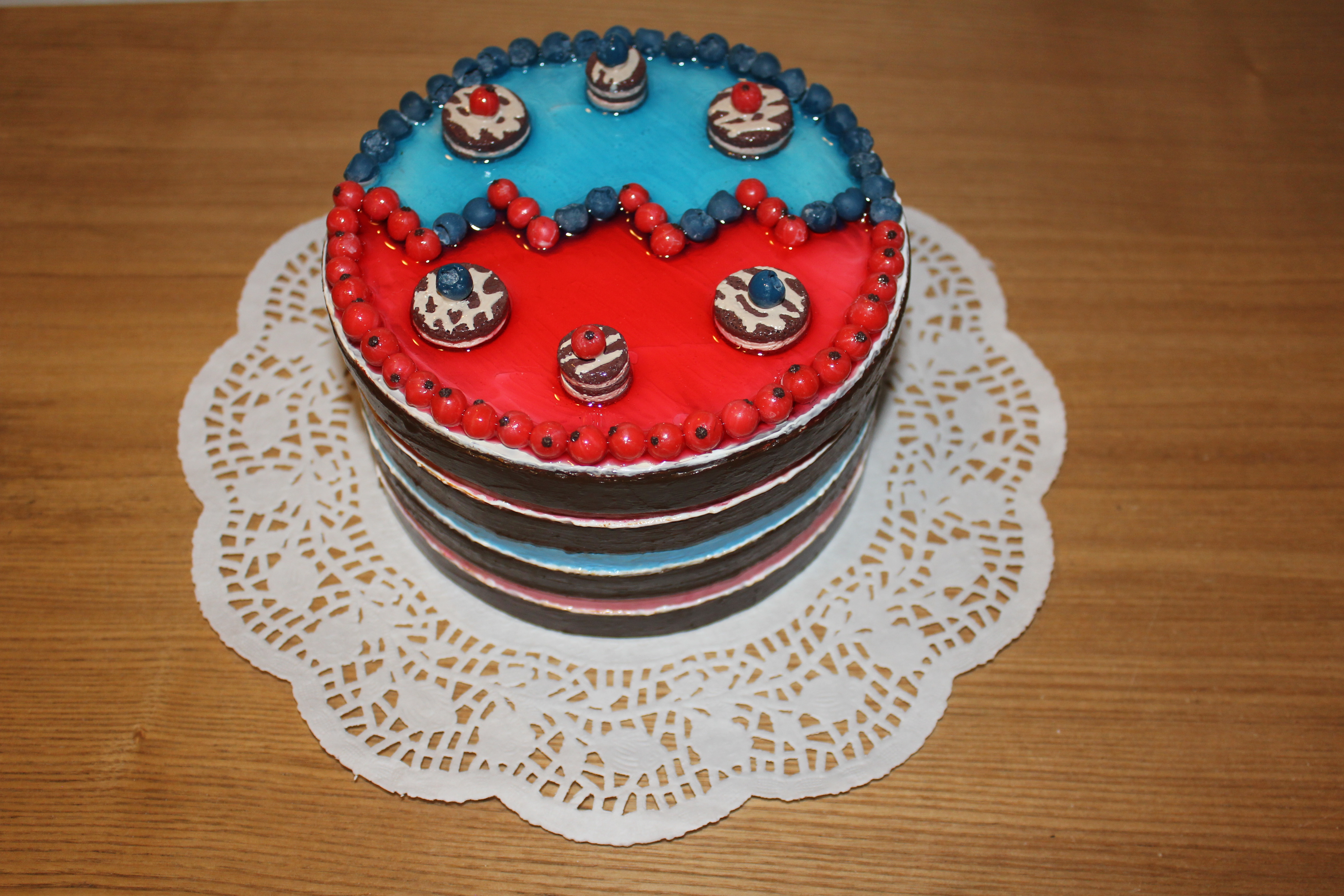 Миная, тортик очень вкусный получился! Особенно мне понравился он до покраски верхней части в сине-красный цвет- он более нежным и «съедобным » смотрелся.