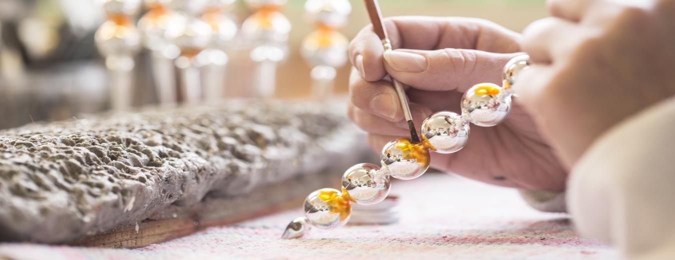 Украшения ручной работы из выдувных стеклянных бусин для елки относится к особому виду ремесла, связанного с рождественскими традициями. Это ручное связывание ёлочных игрушек из стеклянных бусин, которые изготавливают не машины, а местные стеклодувы.