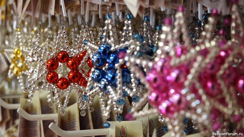 Первоначально бисер использовался для изготовления украшений, но когда в конце XIX века пришла мода на украшение рождественских елок, бедные стеклодувы начали нанизывать бисер на проволоку и делать миниатюрные имитации того, что их окружало. Так создавались бисерные корзины, веера, чайники, самолеты, локомотивы, вагоны или пауки и, конечно же, звезды. Все производство - выдувание бусин в форму, серебрение, окрашивание, огранка и сборка - по-прежнему осуществляется вручную.