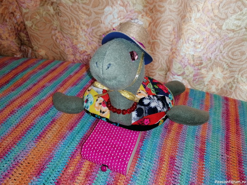 Ещё на нашем форуме участвовала в конкурсе игрушек - мультяшных персонажей. Сшила двух черепашек из флиса и тканей от стареньких вещей. Вот такая влюблённая весёлая парочка получилась))