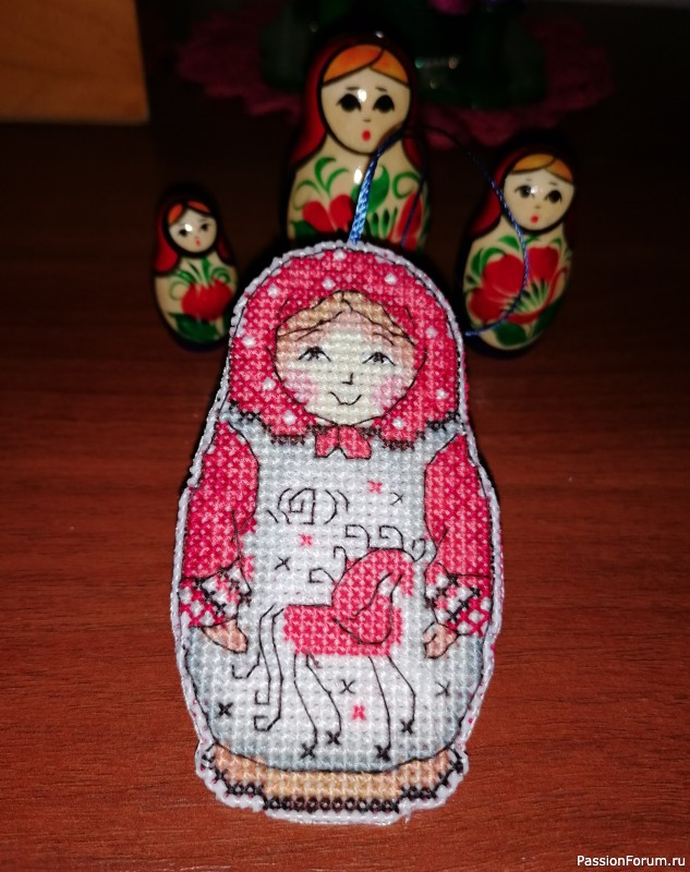 Игрушка на ёлочку - вышитая матрёшка на пластиковой канве из набора от Жар-птицы.