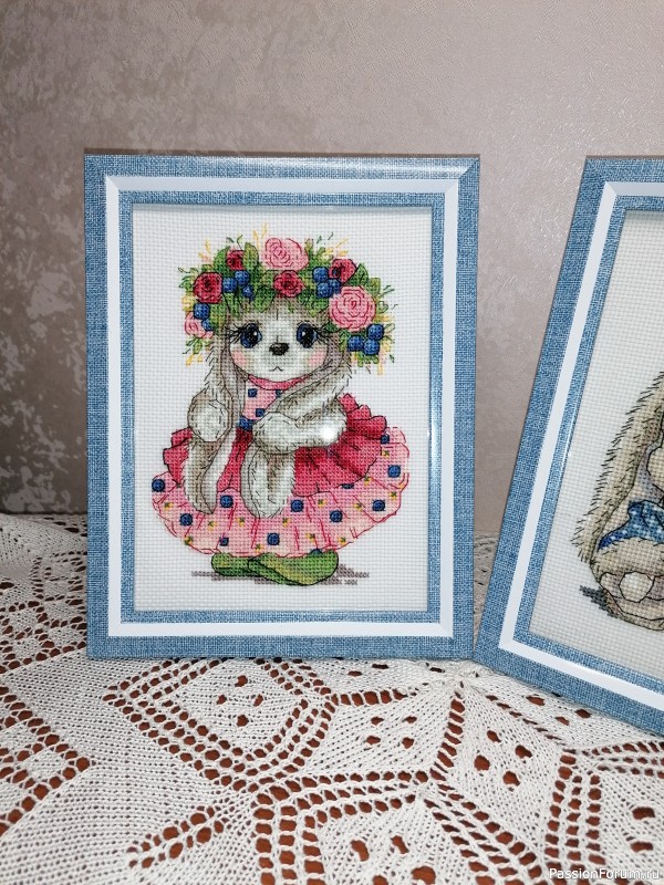 Итак, вышила пару для зайчика-мальчика, которого уже показывала в одном из топиков, - зайку-девочку. Наборы для вышивания крестом на канве с нанесённым рисунком от Джой Сандэй. Сама оформила в рамочки.
