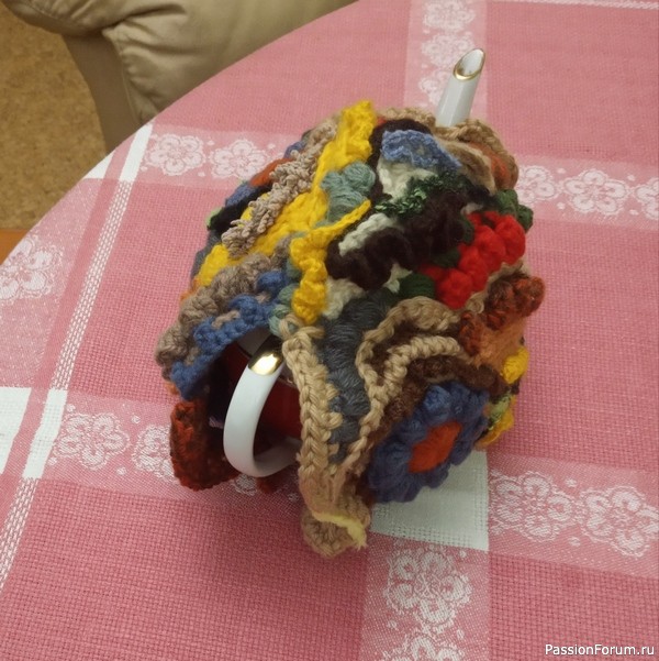 Вяжу я спицами куртку. Устала и от нее, и от спиц, и от однотонности, и от монотонности. Достала свою корзинку с разноцветными маленькими клубочками, взяла крючок и связала скрамбль. Просто чтобы отвлечься от спиц и отдохнуть. Потом связала еще один. Привязала их друг к другу и поняла, что распустить их теперь трудно, а бросить просто так я не могу. Пришлось вязать грелку на чайник. Чайник подруги согласился принять грелку в подарок на Новый год