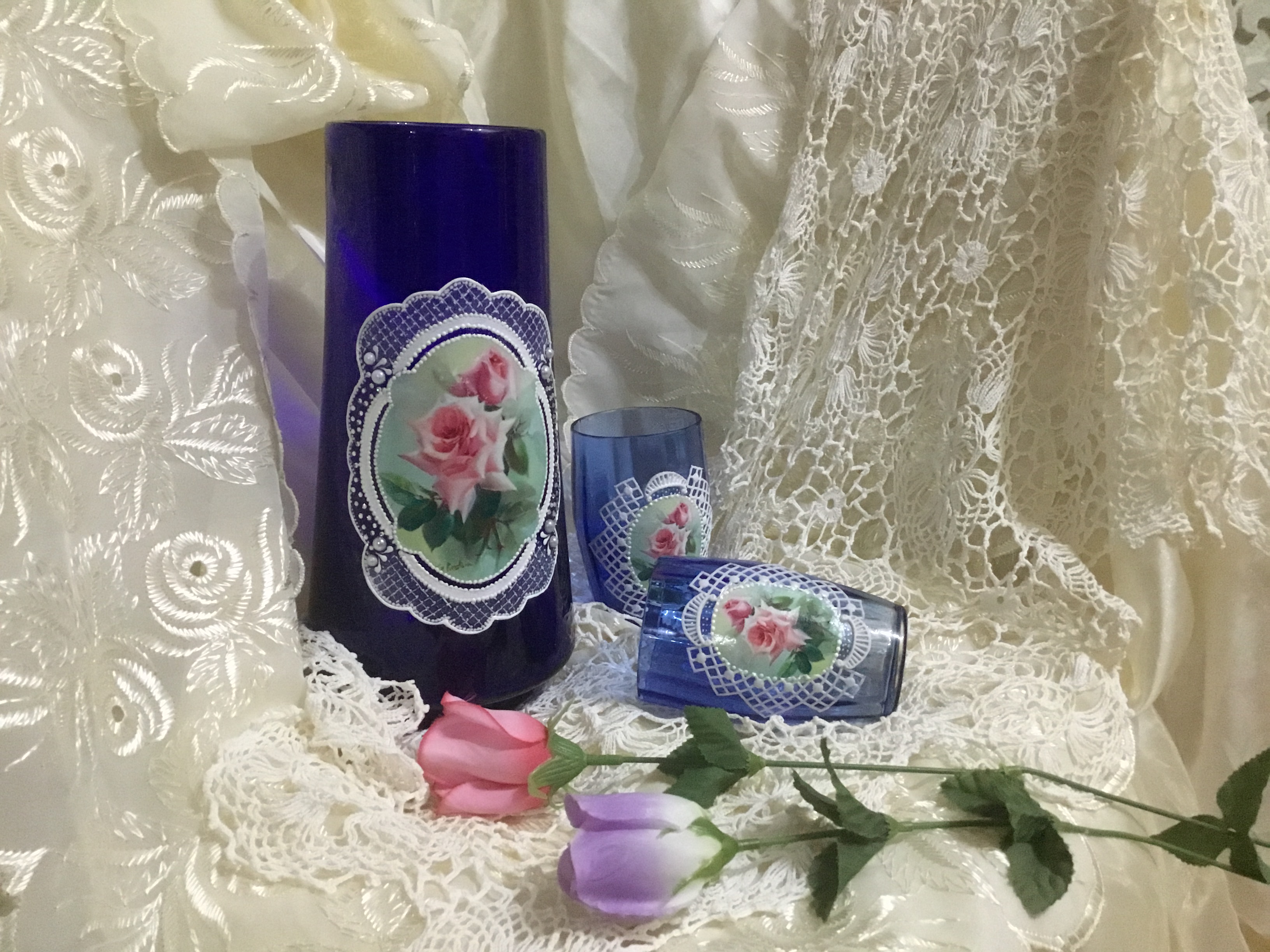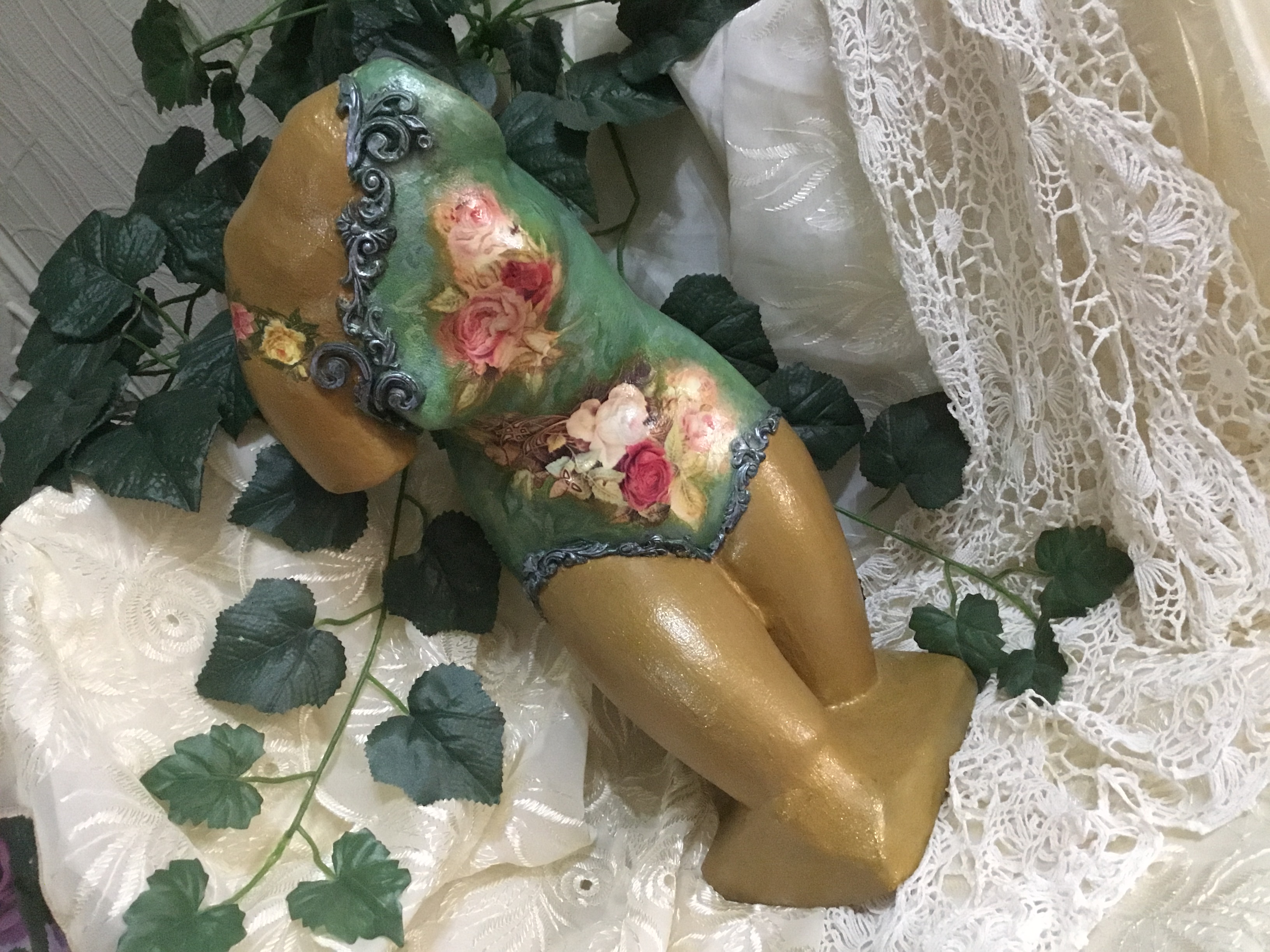 И мне всё очень понравилось Людмила! С такой большой фантазией и умением вы сделали такие прекрасные рамки, родословное дерево восхитило, ваза с бокалами просто супер красивые- салфетки нарисованы мастерски- нежно, изящно! Графины декорированы изумительно, но всё-таки больше всего удивили статуетки- шикарное преображение и главное в этих купальниках они смотрятся еще «стариннее»- купальники 50-60 годов! Отличная работа!