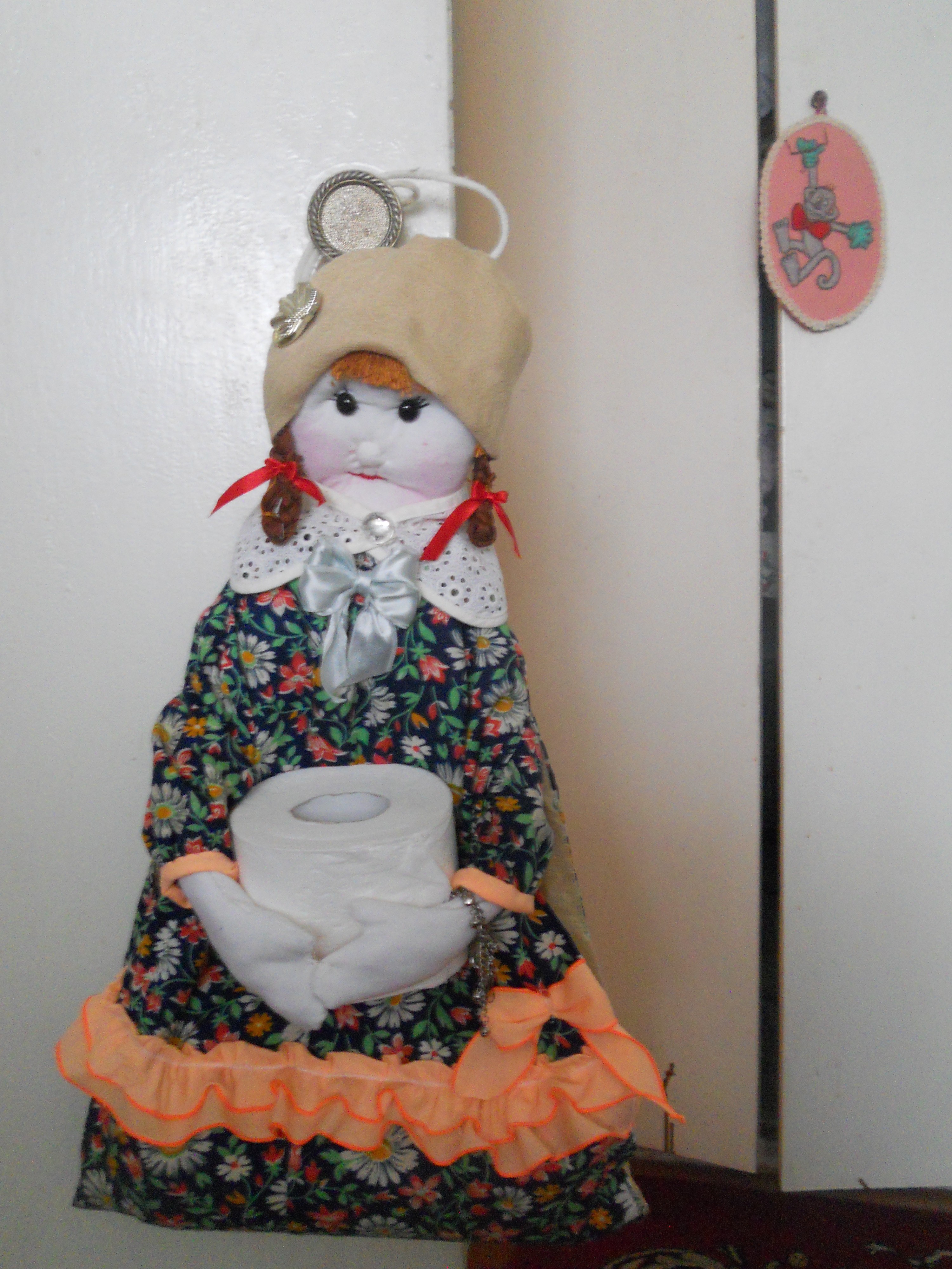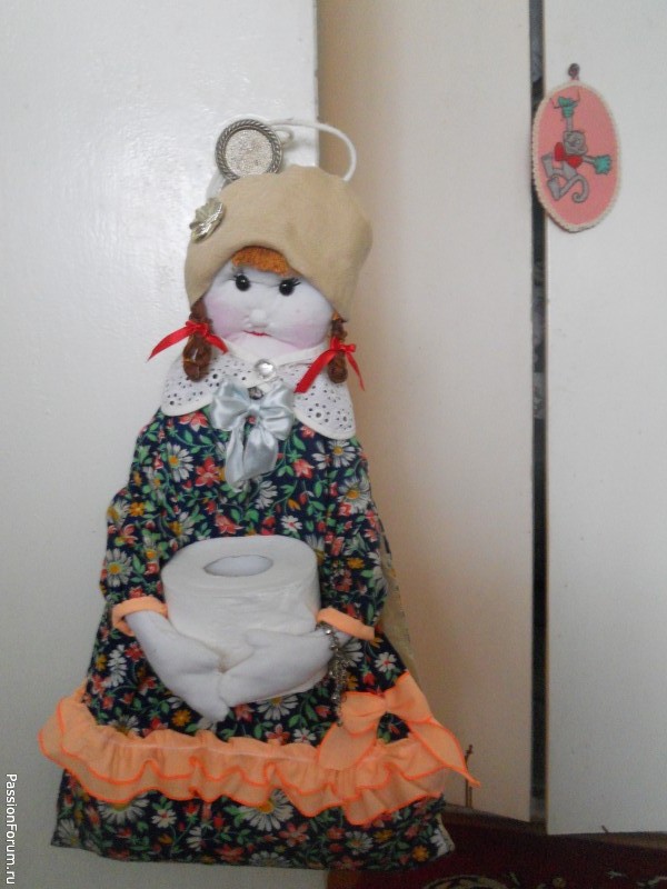 Моя Дуся - хранительница туалетной бумаги: четыре рулона в юбке, один в руках. Очень невзрачное лицо у Дуси: рот ввалился: вероятно, совсем зубы потеряла. Попыталась я сделать мордашку, да первый блин комом. Решила не переделывать: отрицательный опыт тоже важен. Но зато платье в цветочек и бантики, бантики.