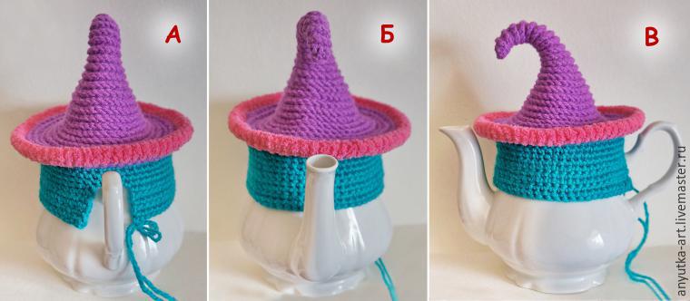 При вязании, чаще примеряйте грелку на чайник и корректируйте количество прибавок согласно форме чайника.