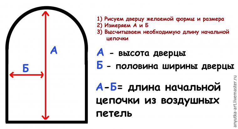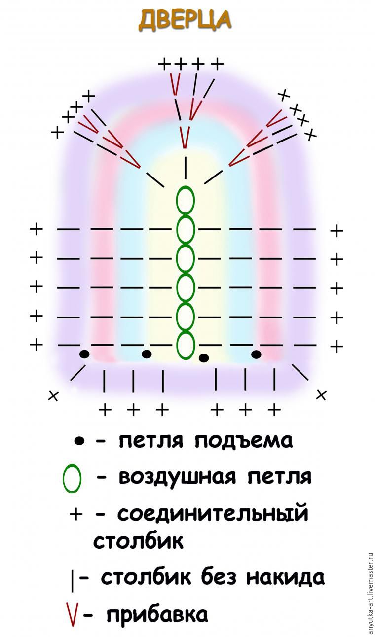 1) Дверь вяжем по схеме полуовала. Количество рядов на схеме условно — вяжите столько рядов, сколько необходимо для желаемого размера двери.