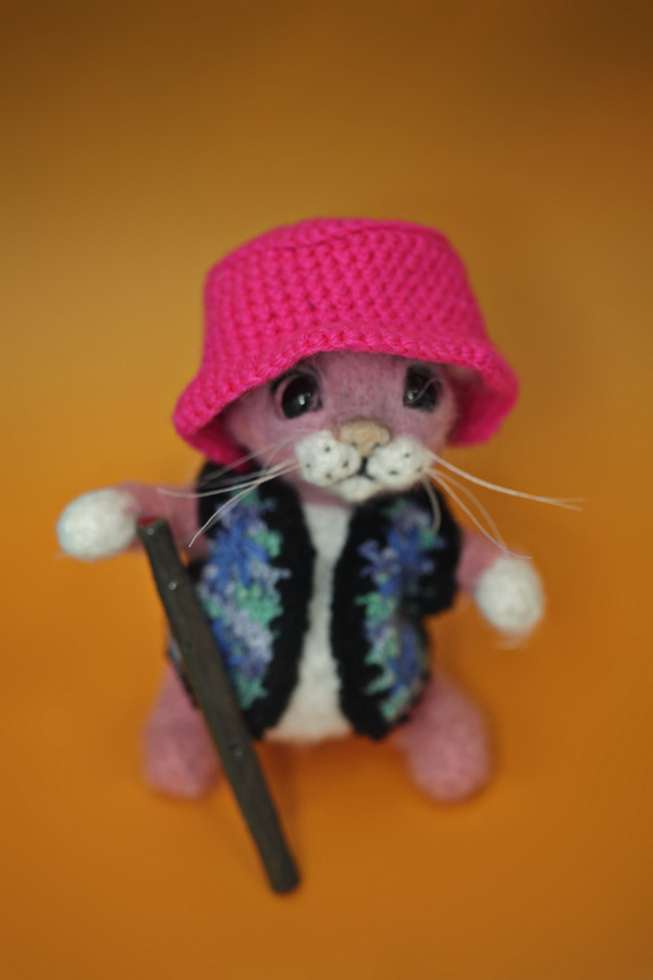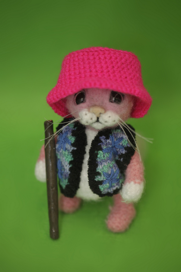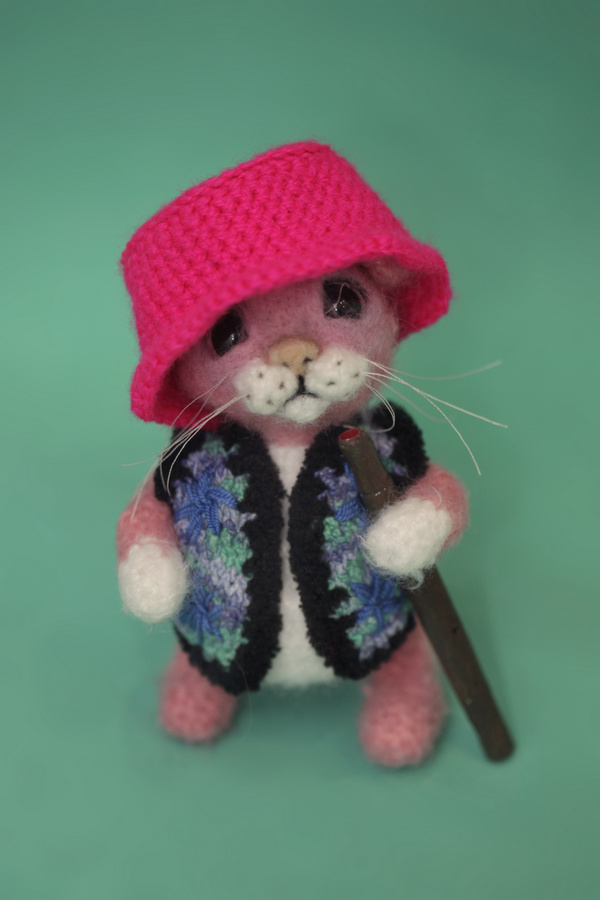 Котик в розовой шапочке связан крючком из акриловой пряжи. Размер - 14 см. На каркасе из проволоки. Одежда снимается. Дудочка из полимерной глины. Ручная работа.