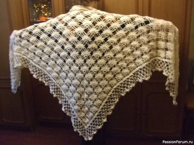 Добрый всем день! Вот такую вязала шаль(даже 2 шали и 2 палантина) в подарок к свадьбе. Дарила знакомая своей сватье, невестке, своей маме и себе заказала. Два цвета шали покажу. 1.связана из пряжи ализе ангора голд симли, крючок 4,рвсхрд более 400 гр (на 100г/550м).сыязать надо было быстро. Не замеряла ничего. Фото не прислали. Все по быстрому фотографировала и передала при встрече.