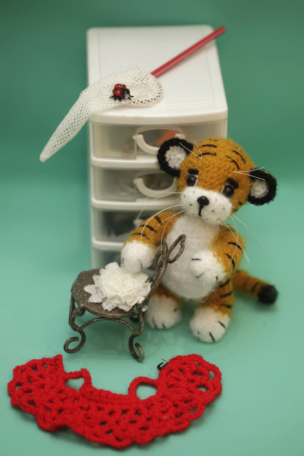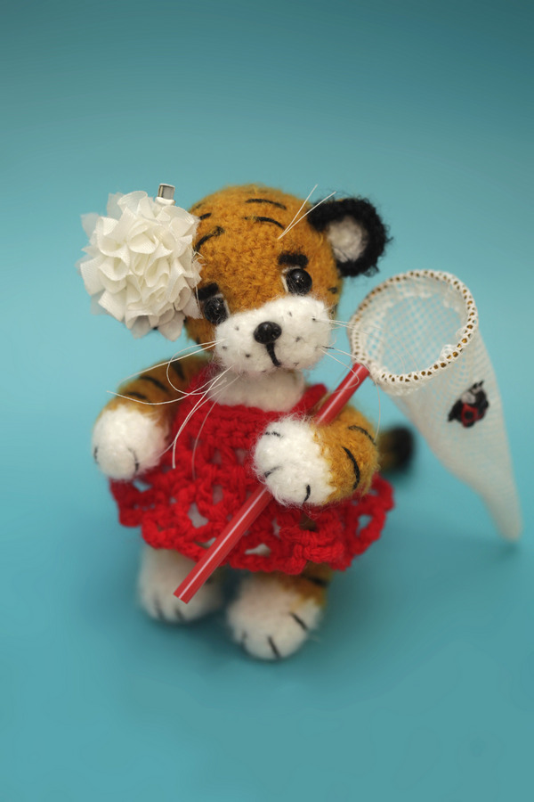 Тигрюля с сачком для ловли бабочек. Размер - 14 см. На каркасе из проволоки. В комплекте к тигренку платьице, цветочек на голову и сачок. Ручная работа.