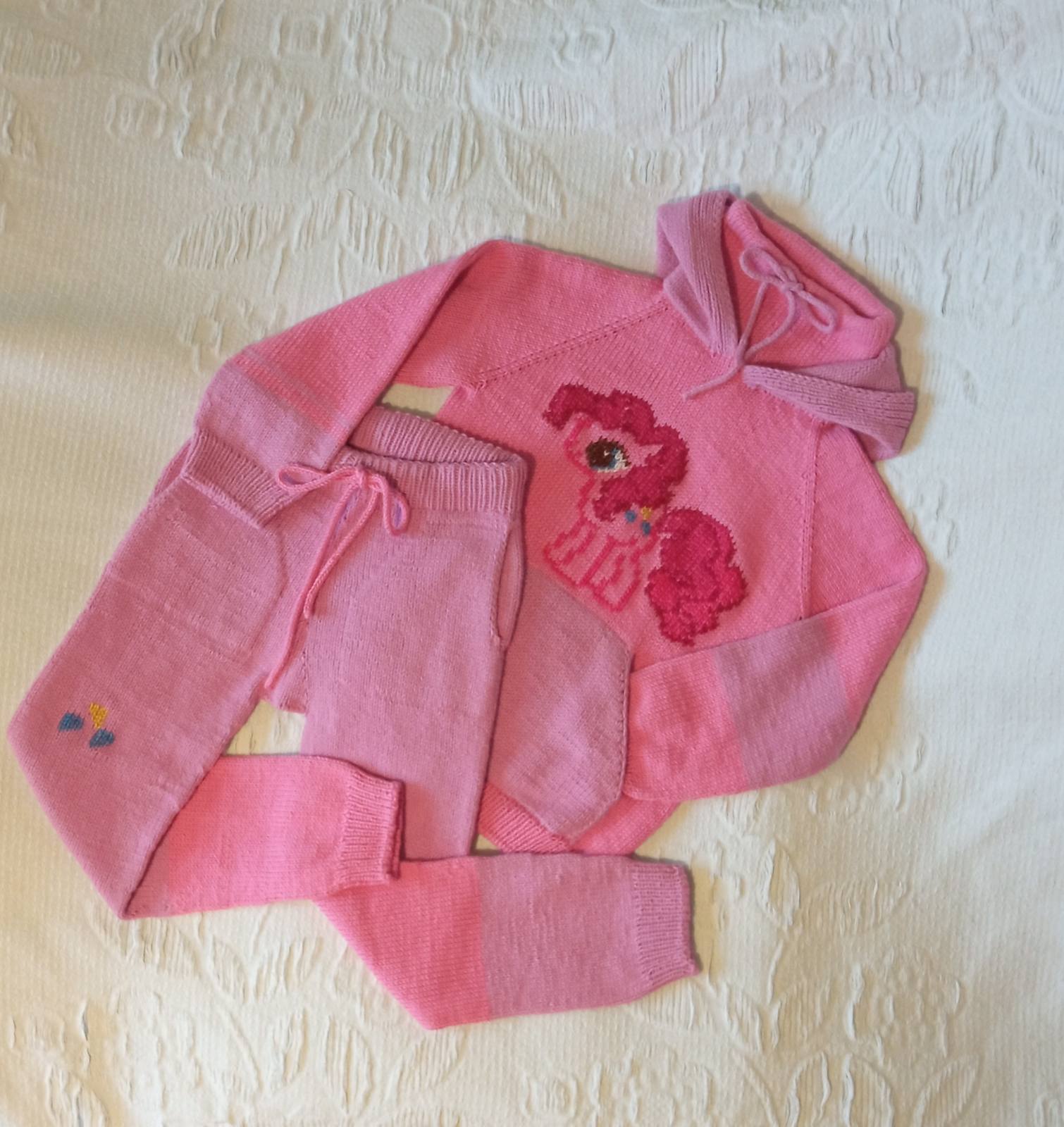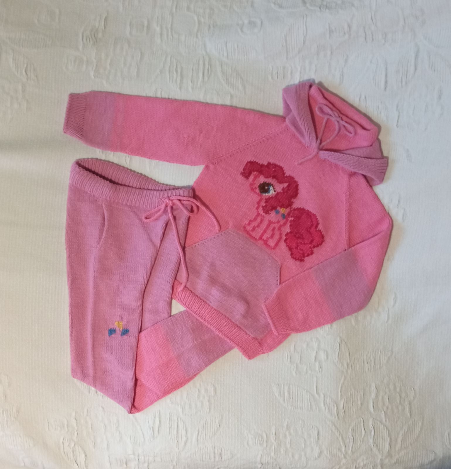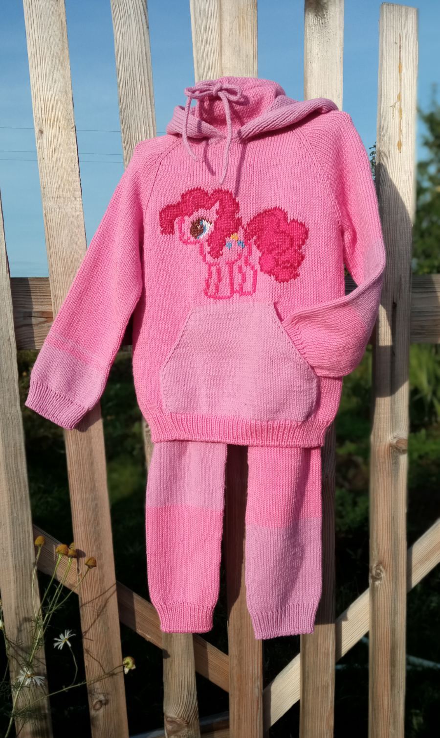 Костюмчик вязала на девочку 4-5 лет, рост 104-110см. Пряжа в содружестве: NAKO Calico 50% хлопок, 50% акрил, 100г/245м и alize Cotton Gold 55% хлопок и 45% акрил, 100г/330м, но по ощущению пряжа совершенно одинакового объема, парадокс такой вот. Спицы №3,5, на резинках №3. Лучше бы вязать на №4, немного плотно получилось.До ВТО и после почти ничем не отличается. Рисунок - вышивка, а вот интарсией было бы лучше, но не нашла подходящих ниточек, цветовая гамма в этой серии пряжи и цвете не такая богатая, а у нашей принцессы пока все в розовом цвете и ничего не поделать, пришлось мулине использовать. Пинки Пай - любимица внучки. Схему нашла на просторах интернета.