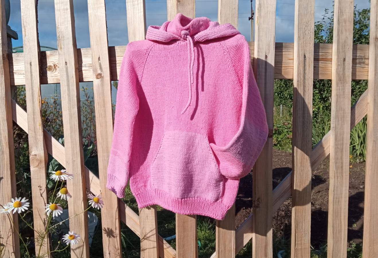 На худи карман-кенгуру, на штанишках боковой внутренний ввязан в процессе вязания.Все резинки закрывала иглой, капюшон ввязывала после того, как связала худи. Худи связала давно, ждала подходящие ниточки на вальдберисе, фотографировала в дневном свете, а вот с вышивкой фотографировать пришлось дома, вторую неделю льют дожди, видимо за лето решили отыграться.