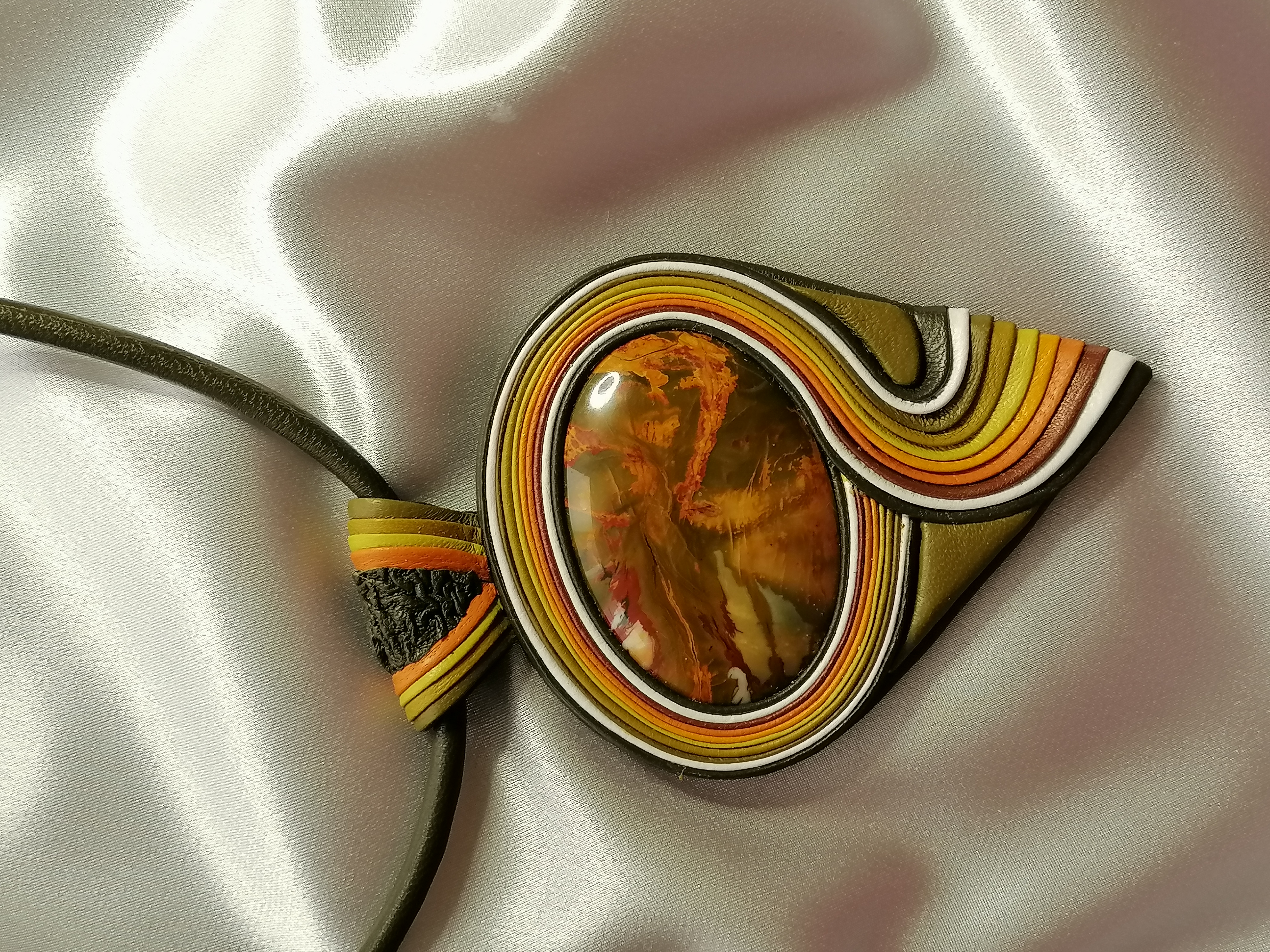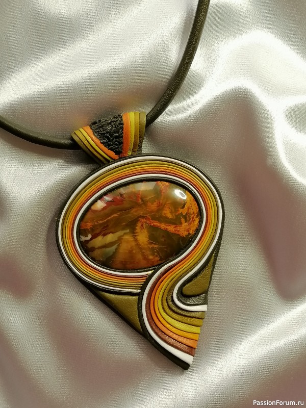Жизнерадостный, цветной кулон с Сибайской Яшмой, в которой собраны цвета осени, под названием " Осенний блюз".